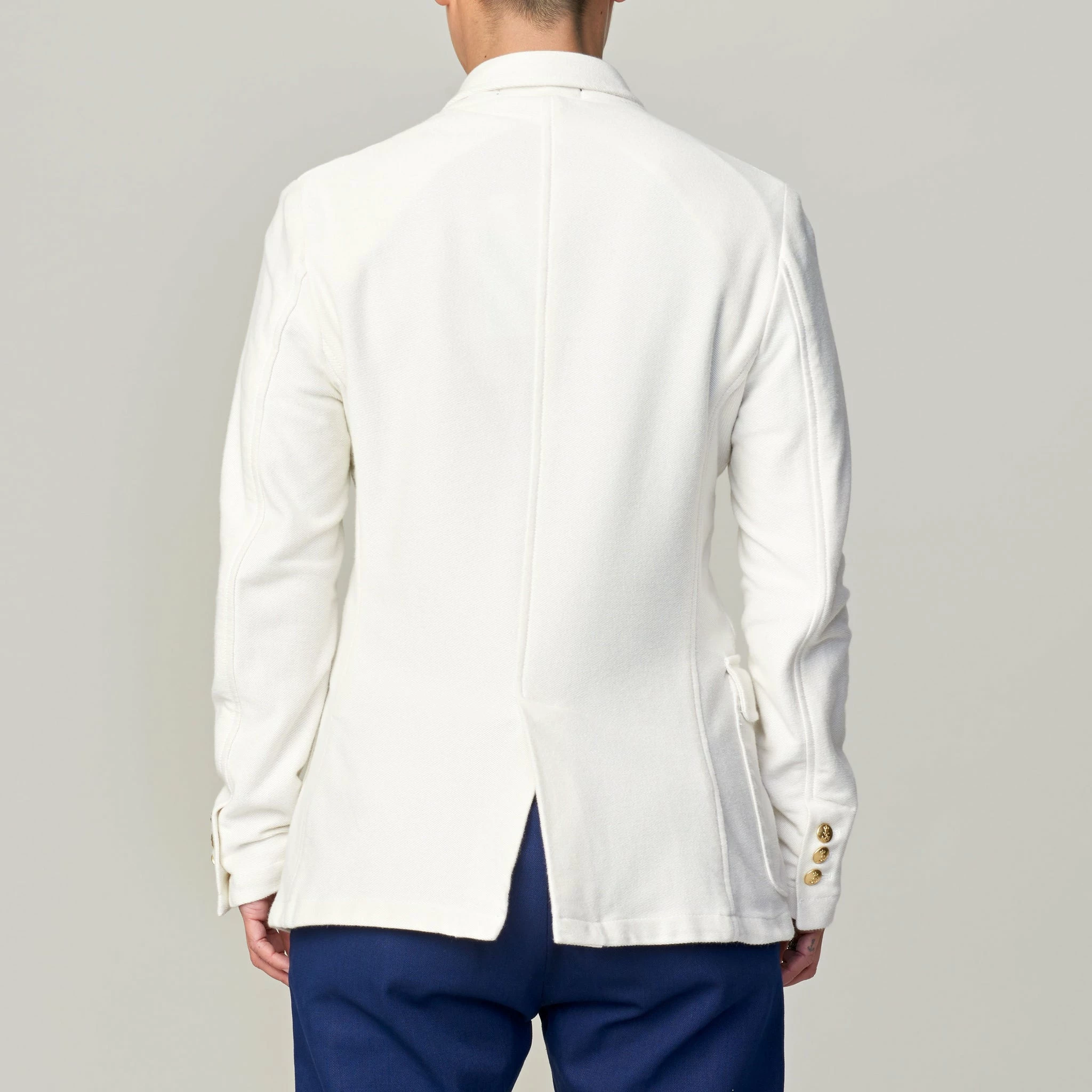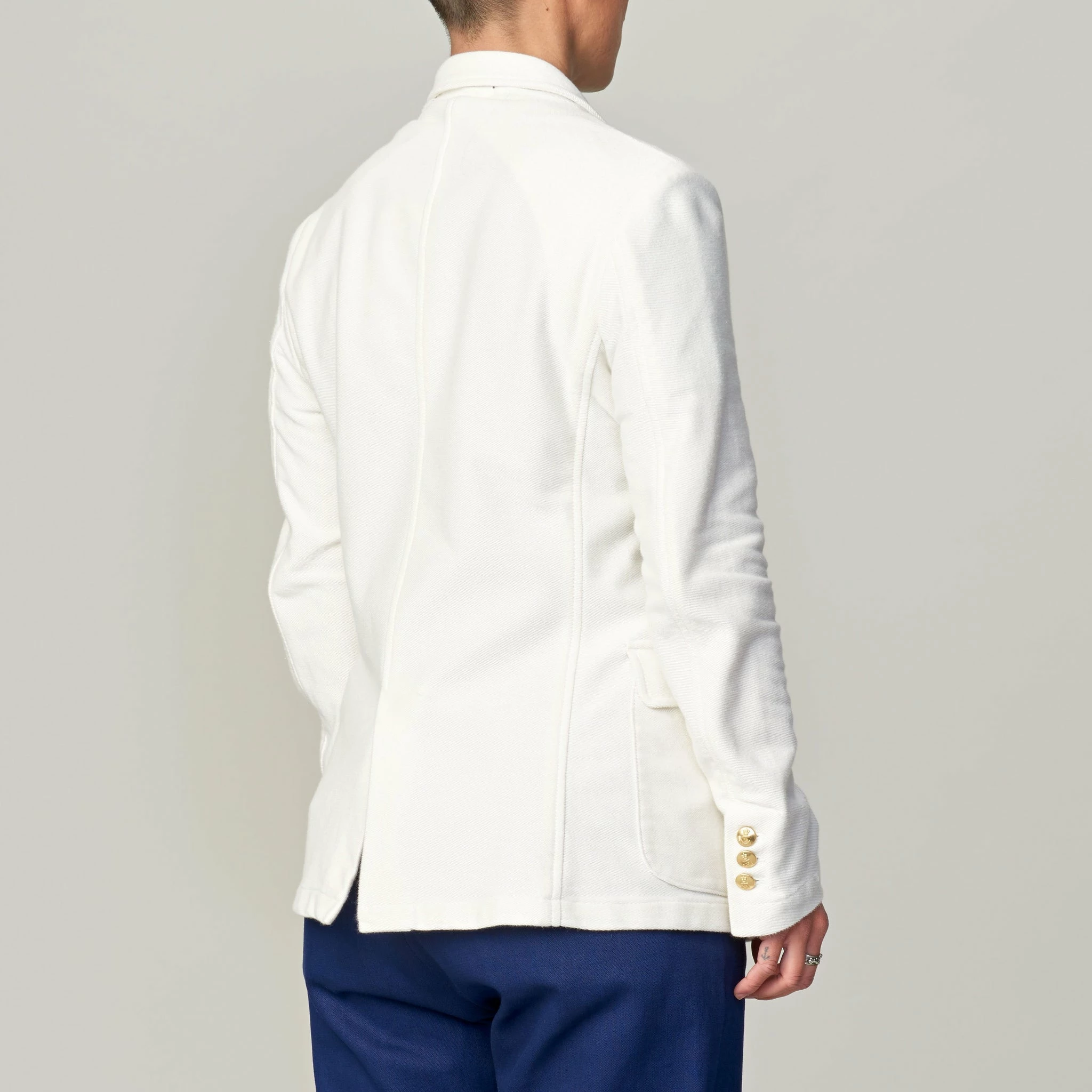 The Campus Blazer is an unlined light weight jacket made from a deep twill woven cotton. It features waist and breast pockets as well as decorative gold button detail.