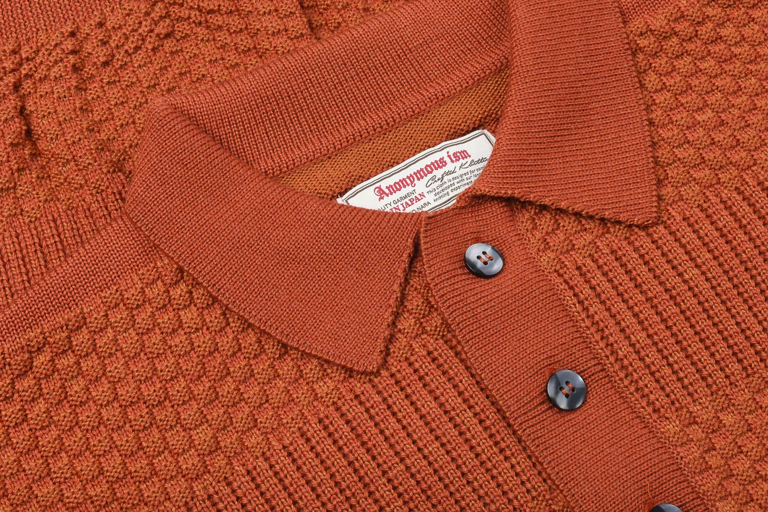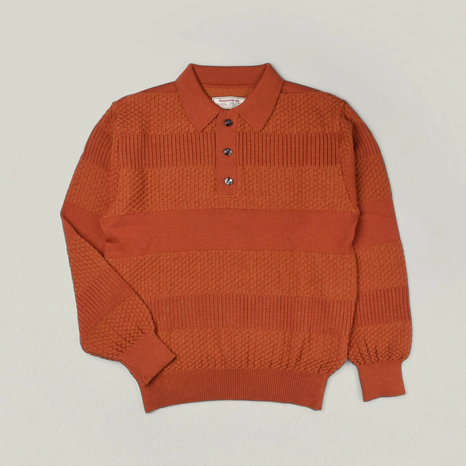 Masters of knitted socks have turned their mechanical arms to knitted sweats and tops, this their second season and the results have been fantastic. We are big fans of long sleeved polos and though simple in comparison to other knits from these guys, this has alternating stripes of moss stitch, creating texture and general refined comfort. Details include three chunky pearlescent buttons to fasten.