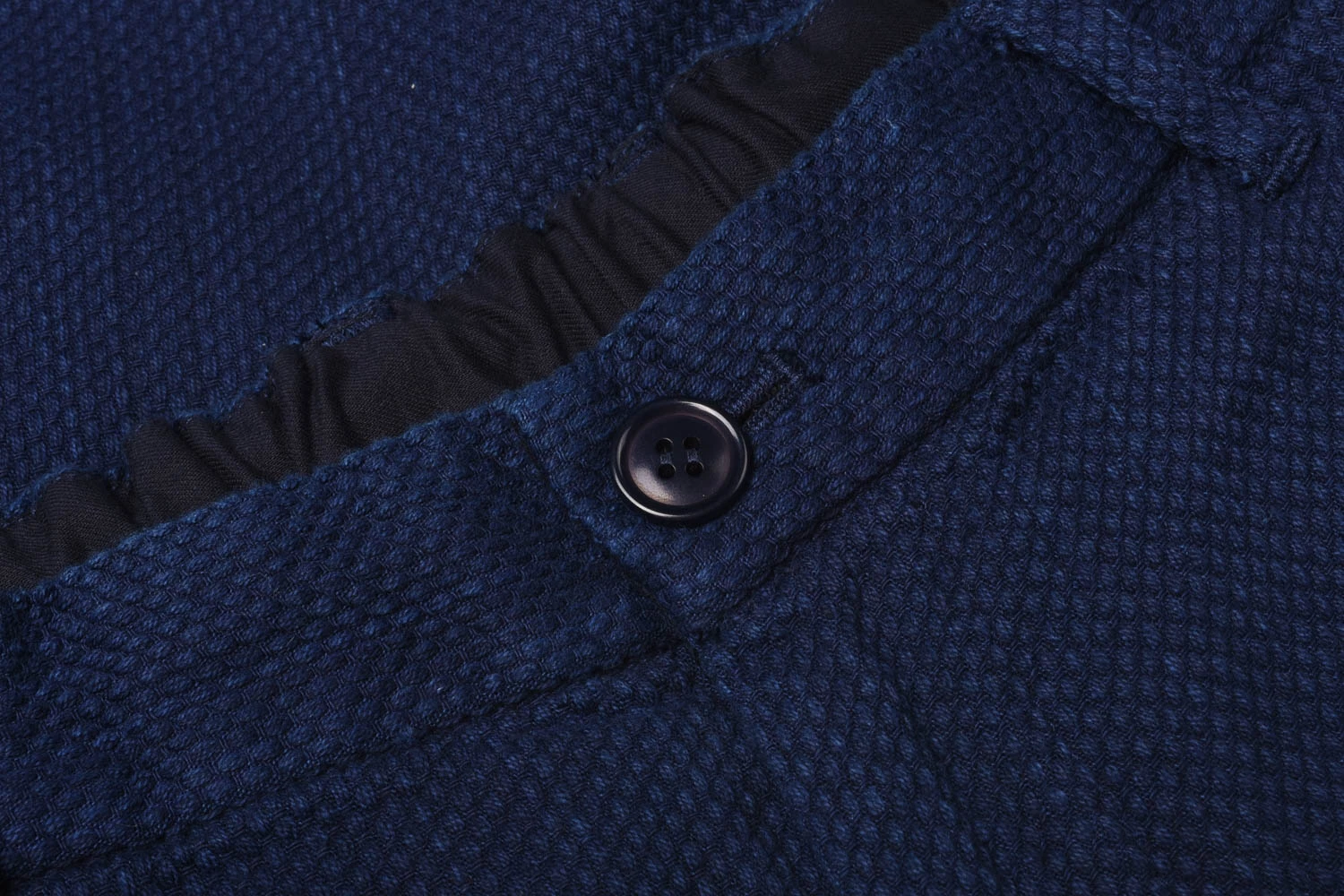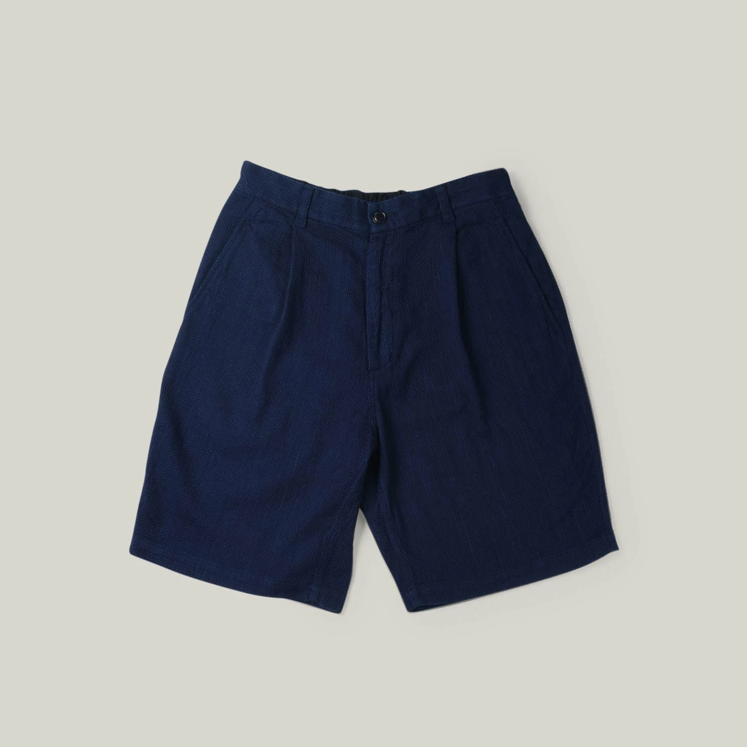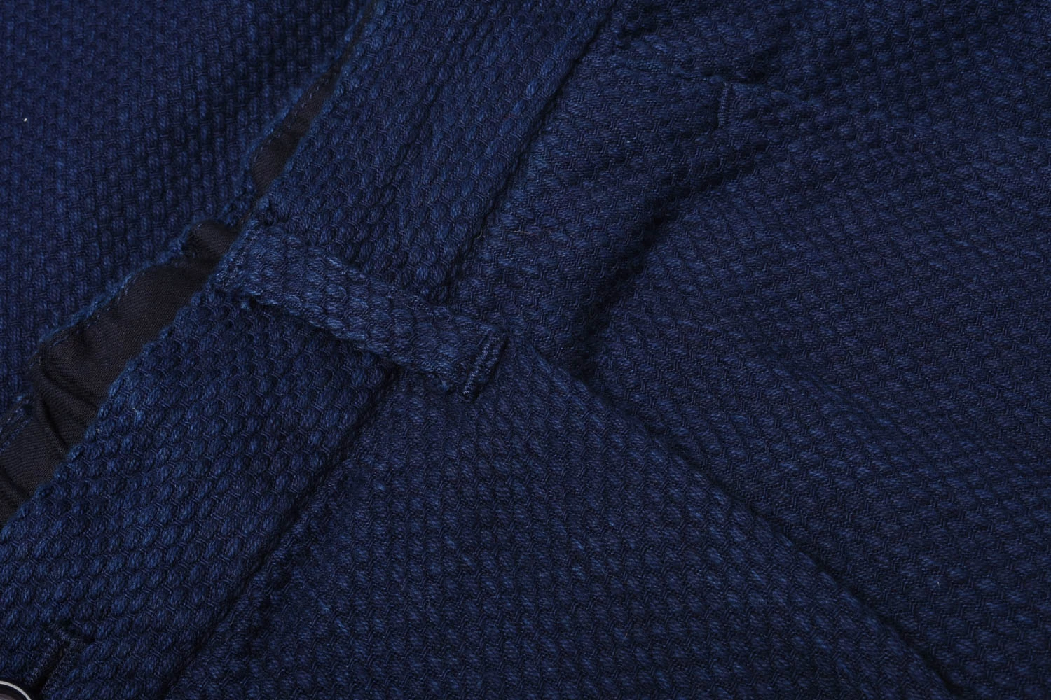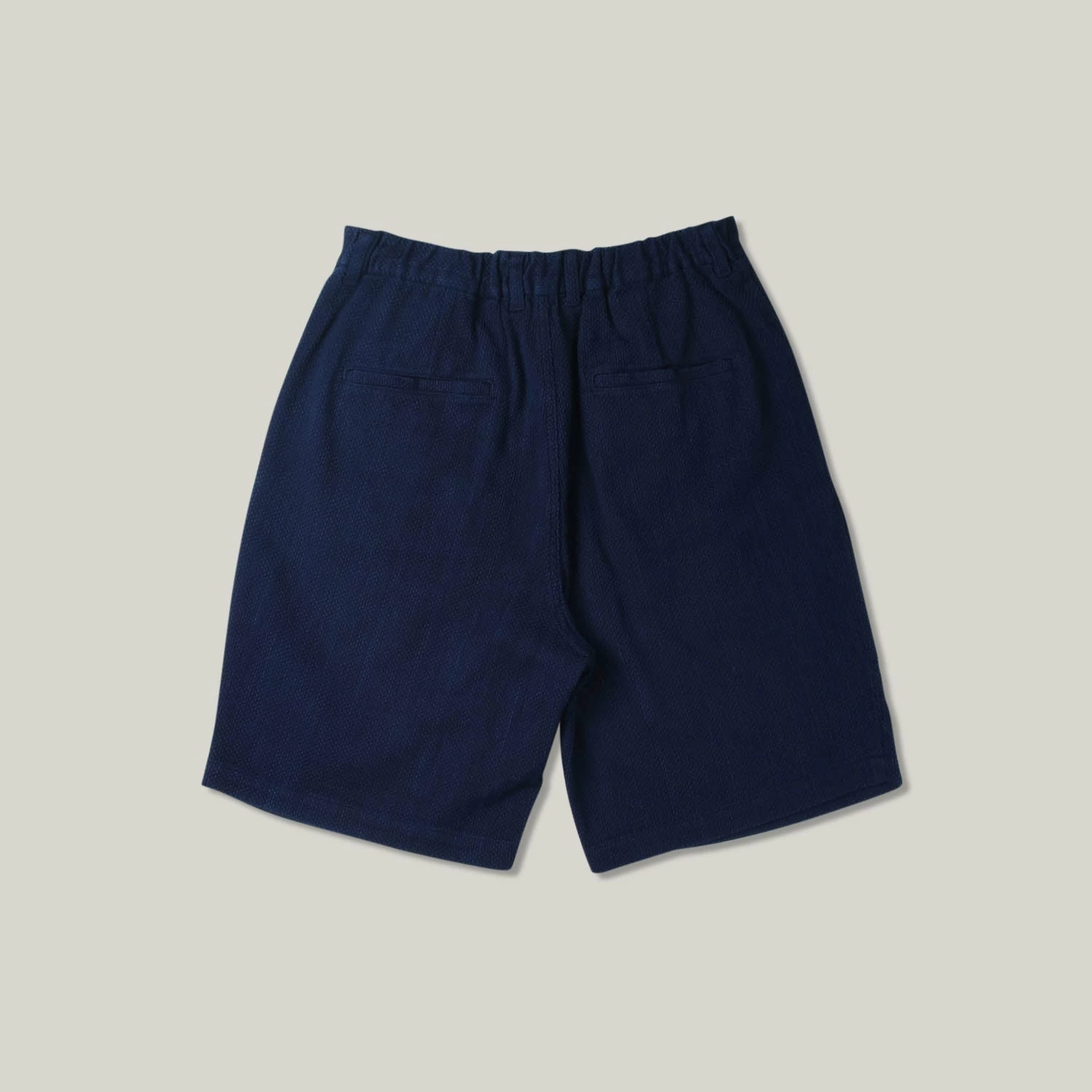 A shorter version of the staple sashiko one tuck pants are these summer short trousers. Made in the same densely woven judo fabric, these are soft and breathable yet incredibly robust. Smart and comfortable simultaneously thanks to the elasticated waist and single pleats. Belt loops and zip fly also. A nice deep hue for these.