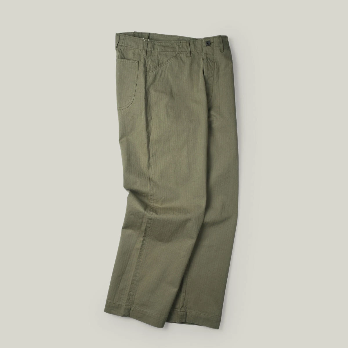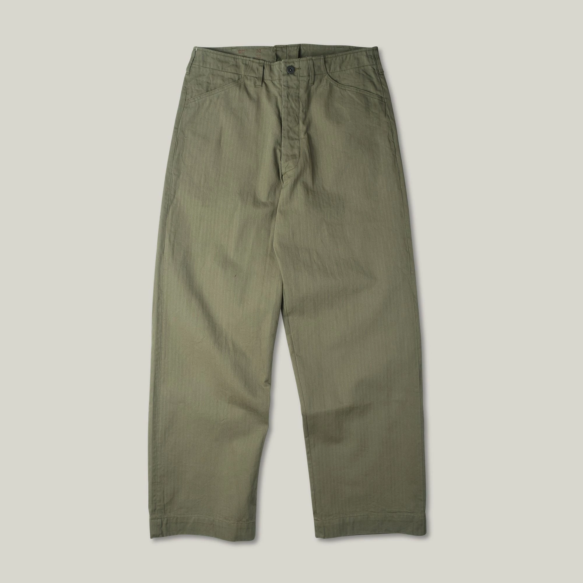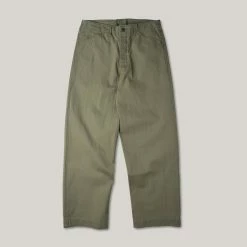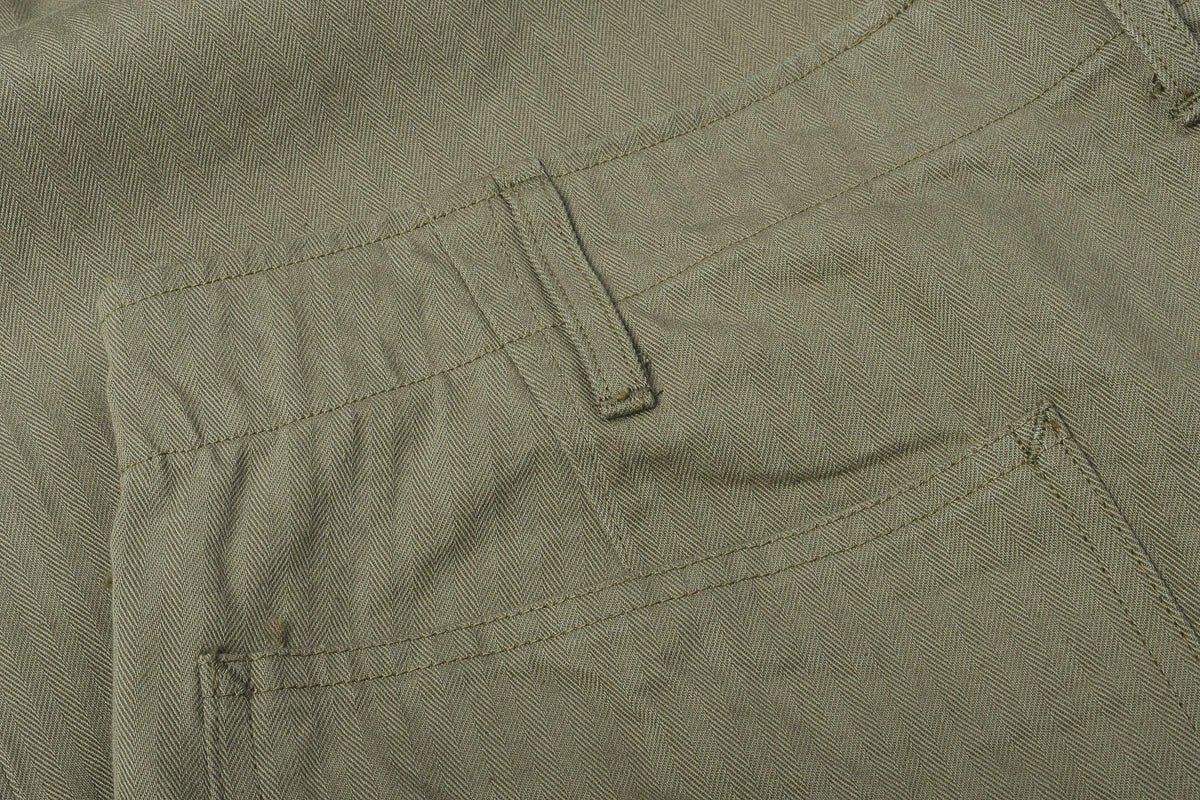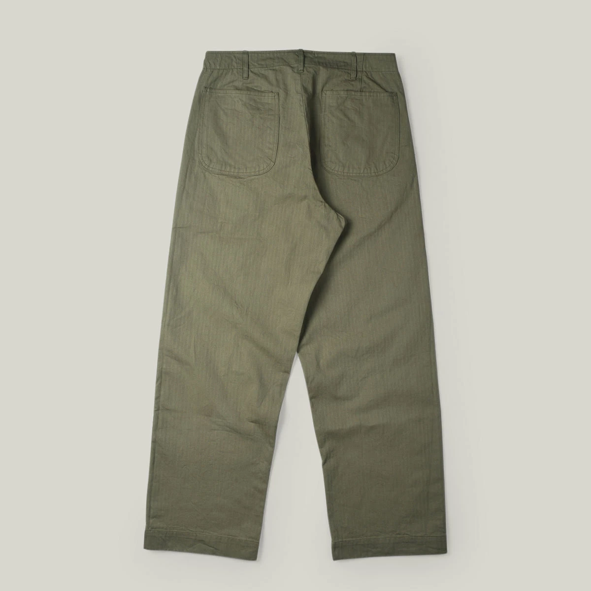 Most probably the widest trouser we have in our arsenal here at the shop and this particular version is an exclusive to us here at PPHH, with the omission of the back military stencil. We think this makes them just a little bit more timeless & special, forcing you to concentrate on the thick herringbone twill and excellent wide fit. Further details include belt loops, patch back pockets, two angled front pockets and pressed metal buttons used on the fly.