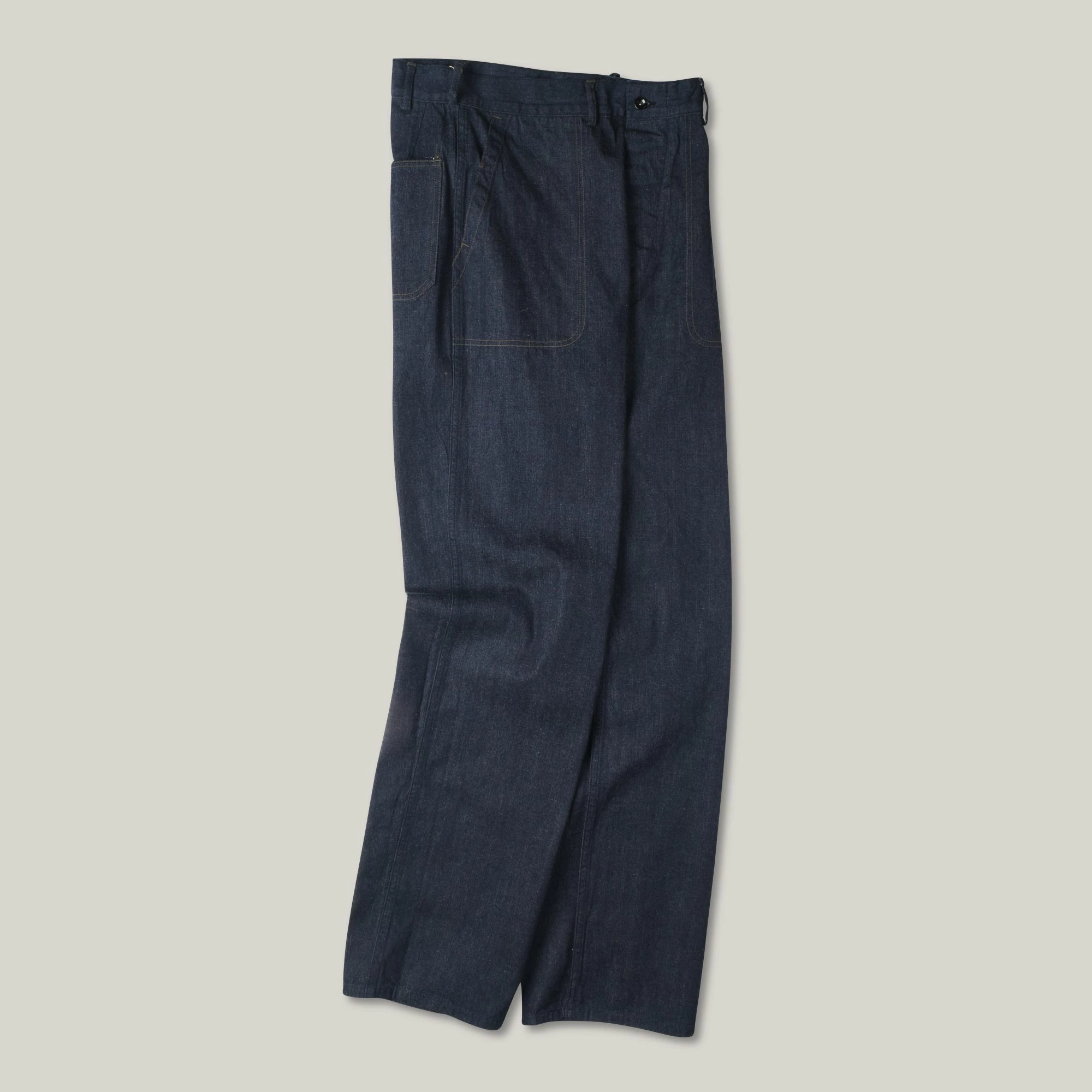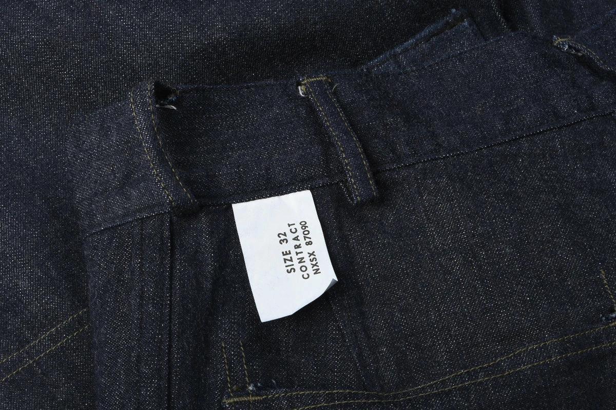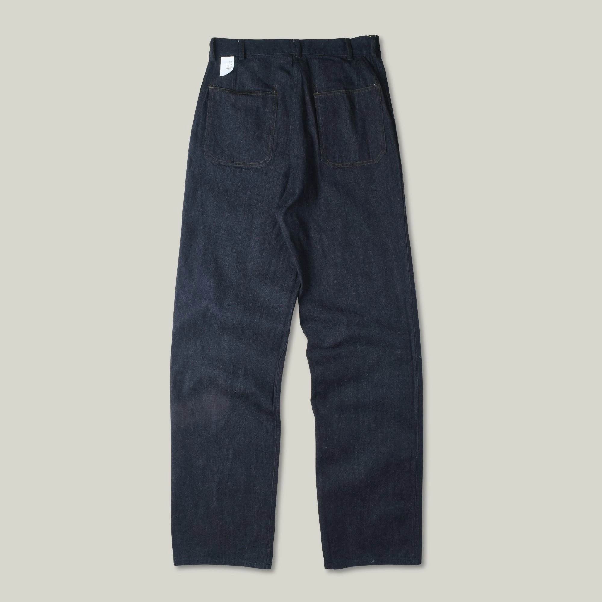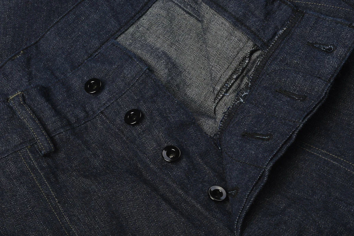 A superb reproduction of the M-45 denim trousers worn by the U.S. Navy during WWII. The originals would have used black or navy thread, instead Buzz have opted for an olive which enhances the small details and gives a class to the most humble of work pants. The fit is wide with a high rise, deep front patch pockets and belt loops. Lovely hardware on these in the form of black donut buttons, aloft a murky blue 10oz denim.