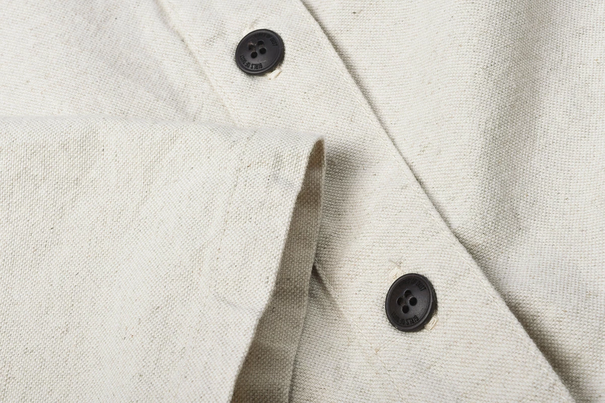 The perfect playsuit, made in 100% raw cotton, this is soft and comfy enough to render you almost prostrate whilst wearing it. Details include open neck, 3/4 sleeve, large patch pockets both front and back to hold all your juggling balls and large cat’s eye buttons used throughout which have become a signature part of G.o.D apparel. Also features a nice little workwear detail of cinch back, to give shape if required