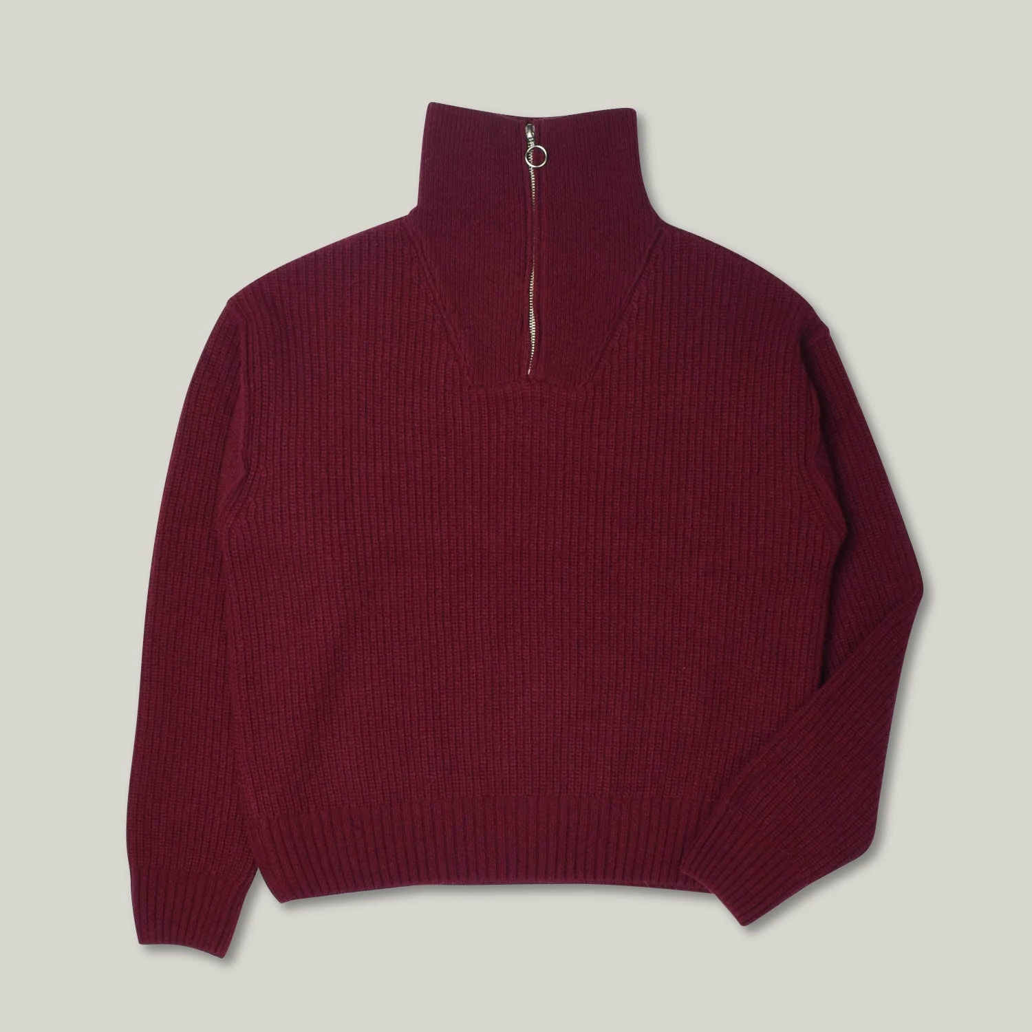 The deck sweater returns once more with all the same details. These include boxy fit with with slightly cropped length, drop shoulder and funnel neck that fans out flush when the ‘O’ ring zipper is down. This time in burgundy to disguise all the merlot stains.