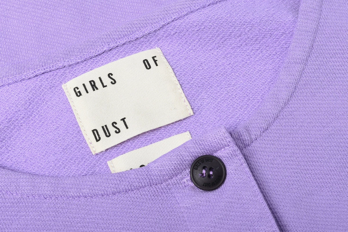 It’s back and this time in luscious lavender. This sweater has the look and feel of one that has been around for years, bringing comfort to all and sundry. The shape is slightly boxy with flat bottom, a wide neck and sportswear cuffs. Corozo buttons also. The organic fleece inside makes you feel like you’re in a fabric softener commercial when you put it on.
