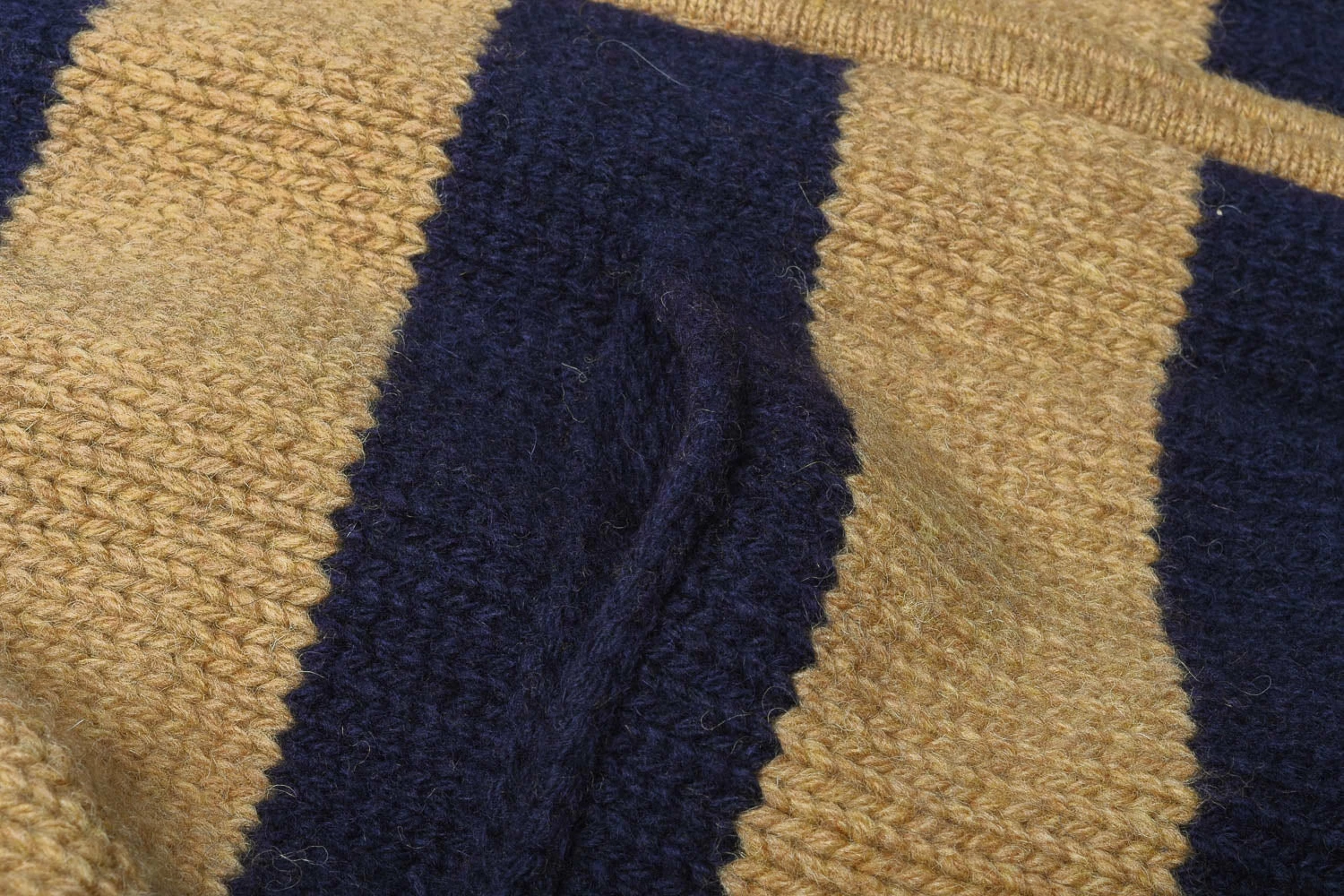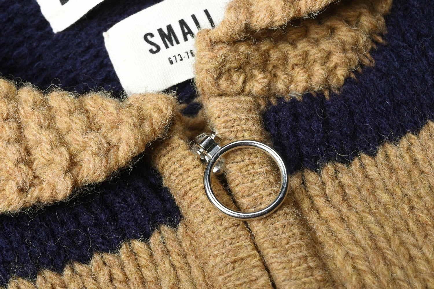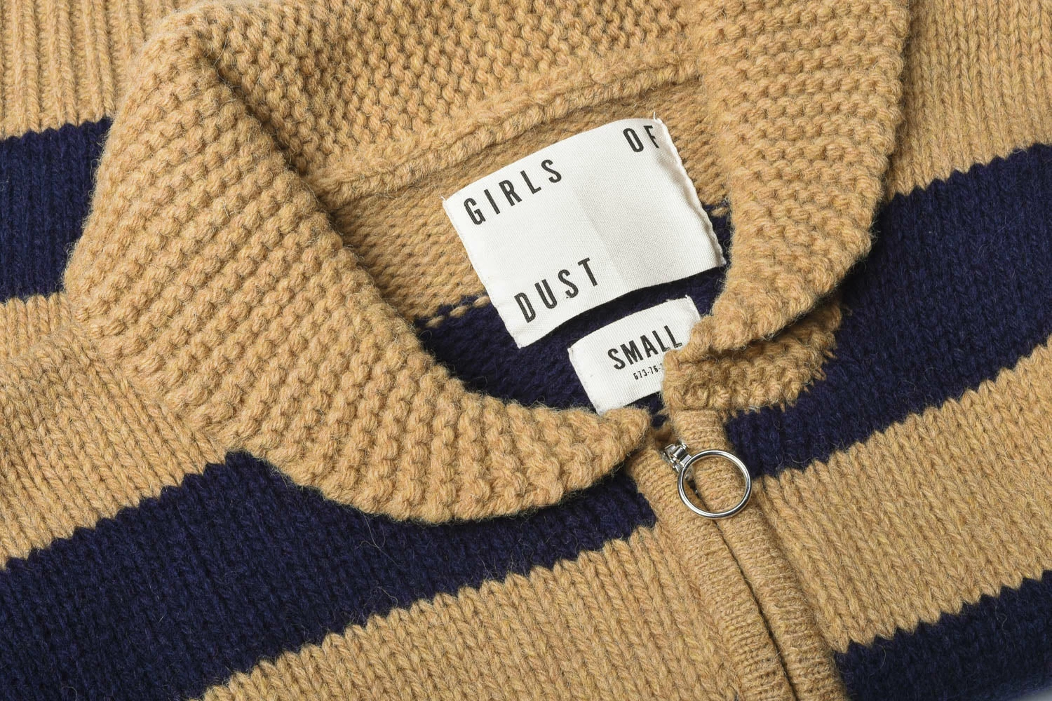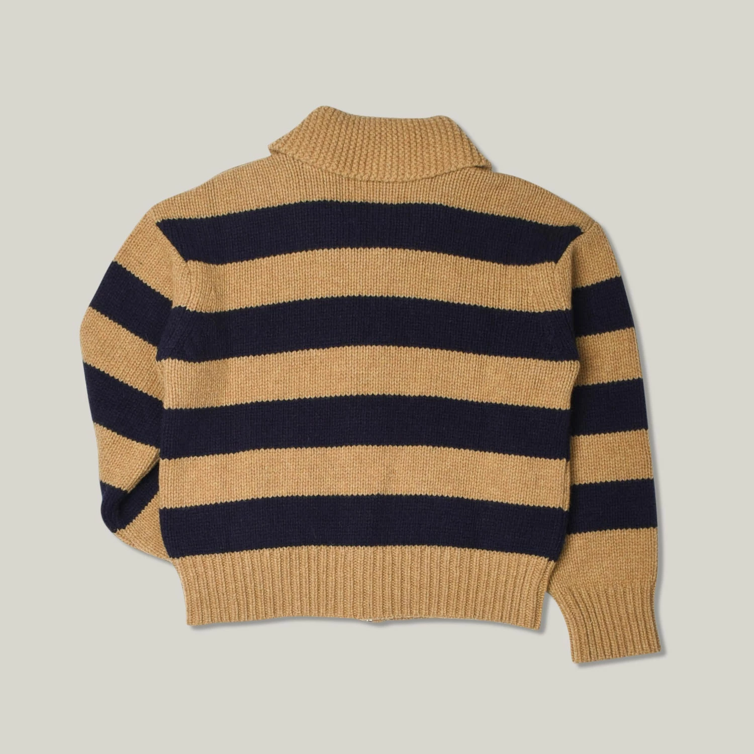 There is a real 1940’s vintage Ivy League feel to this piece, with contrasting stripes of light gold and navy, a shawl collar to combat neck chills and an ‘O’ ring zipper to fasten right through the middle. Details include two front pockets for firelighters and tissues.