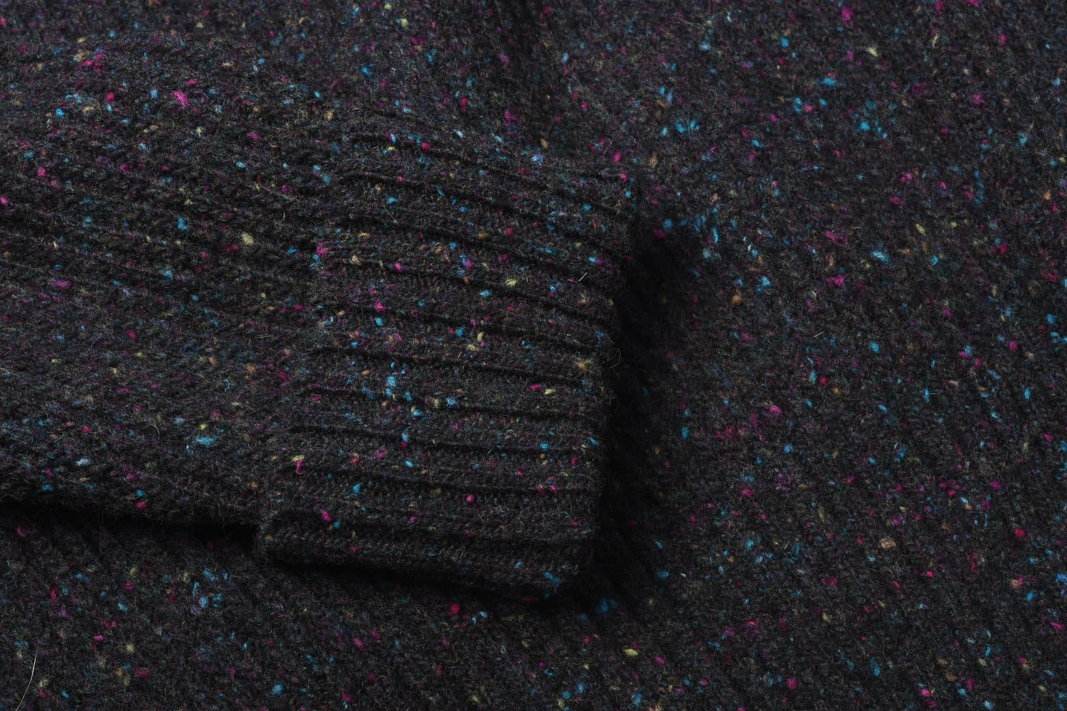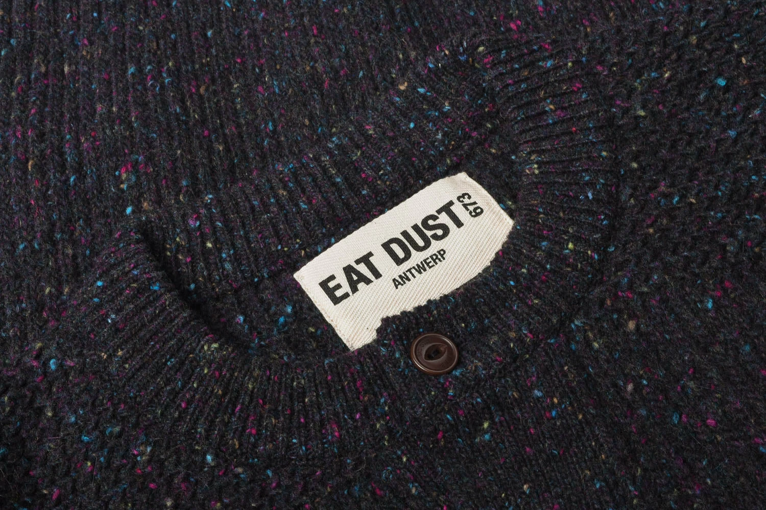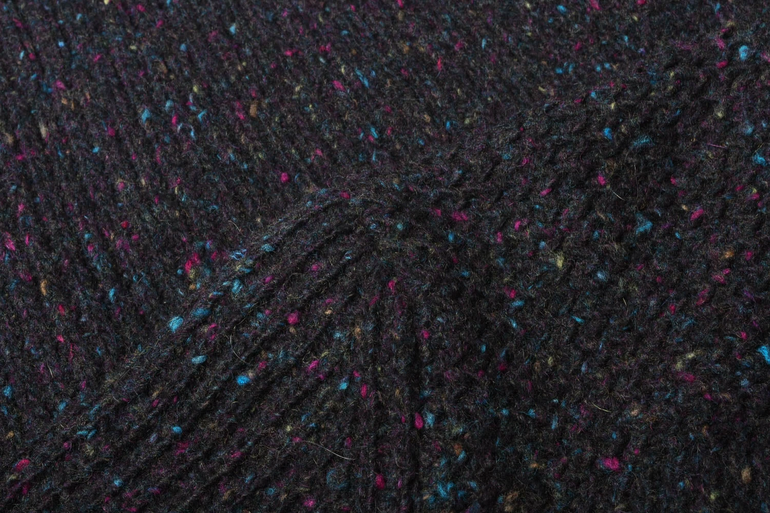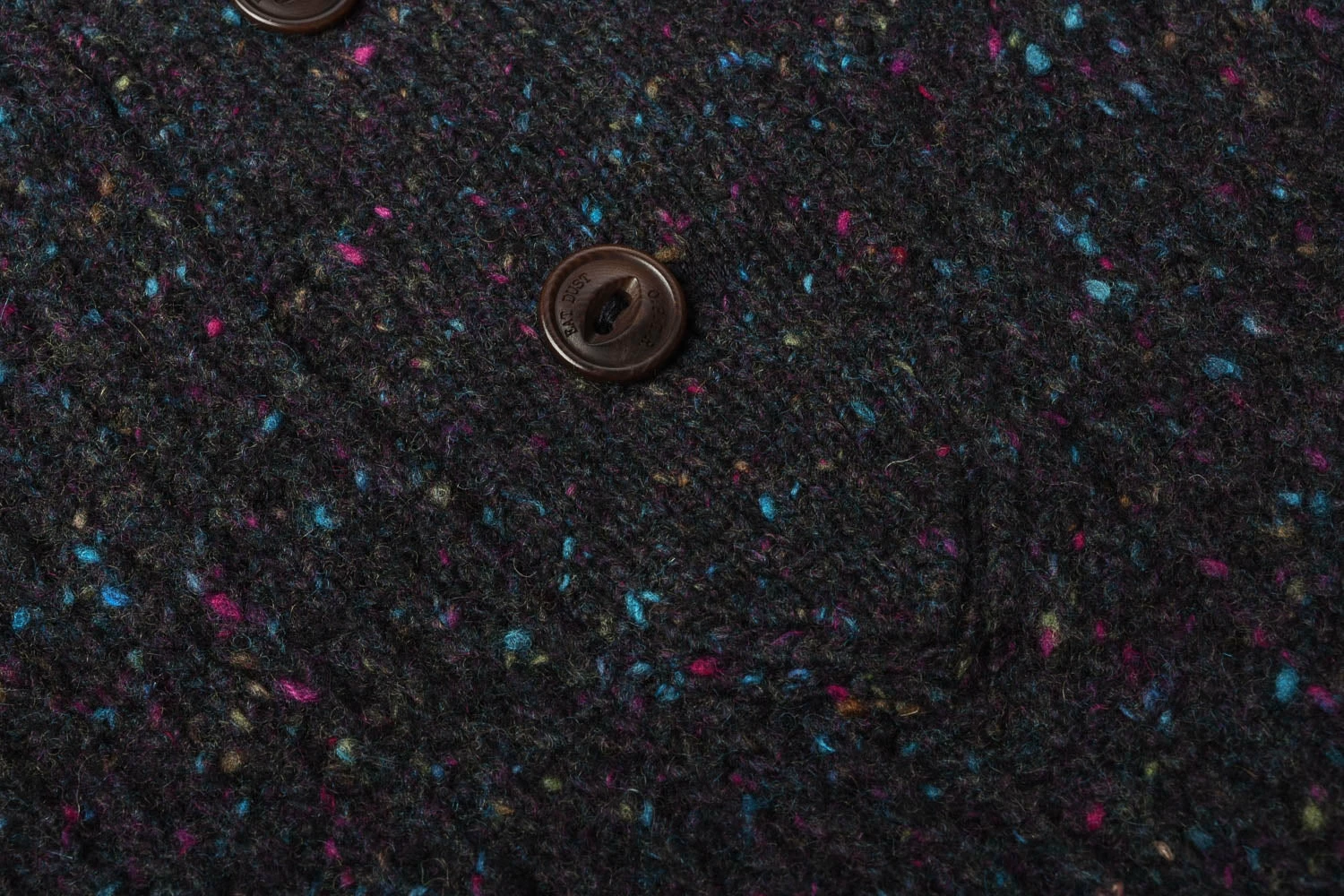 Thick henley-necked knit in a wonderful asphalt grey knit, peppered with multicoloured neps of loveliness. The fit is generous and a unisex piece. Details include three of their brown staple cat’e eye buttons to fasten.