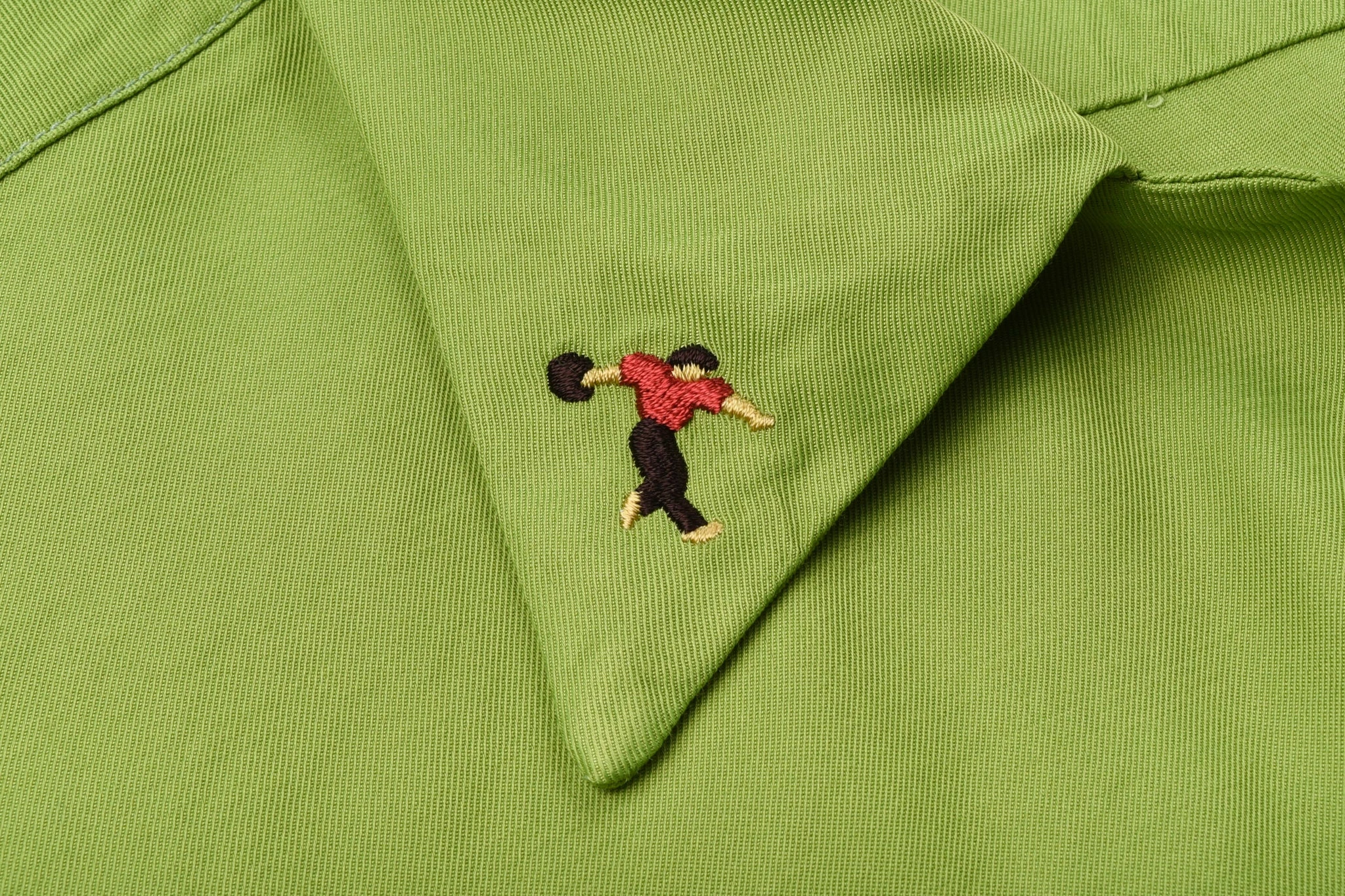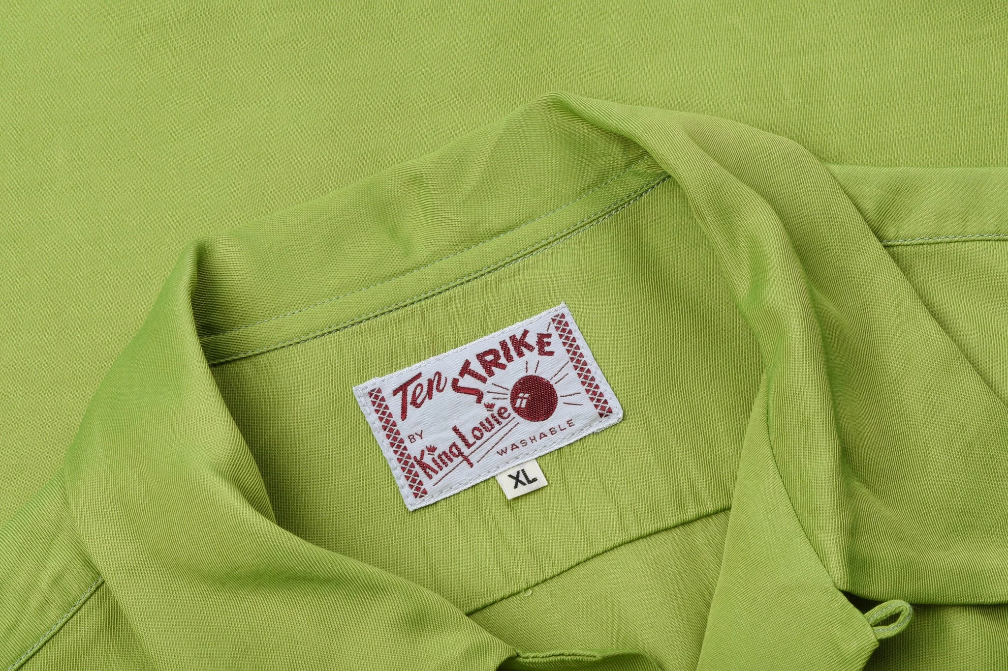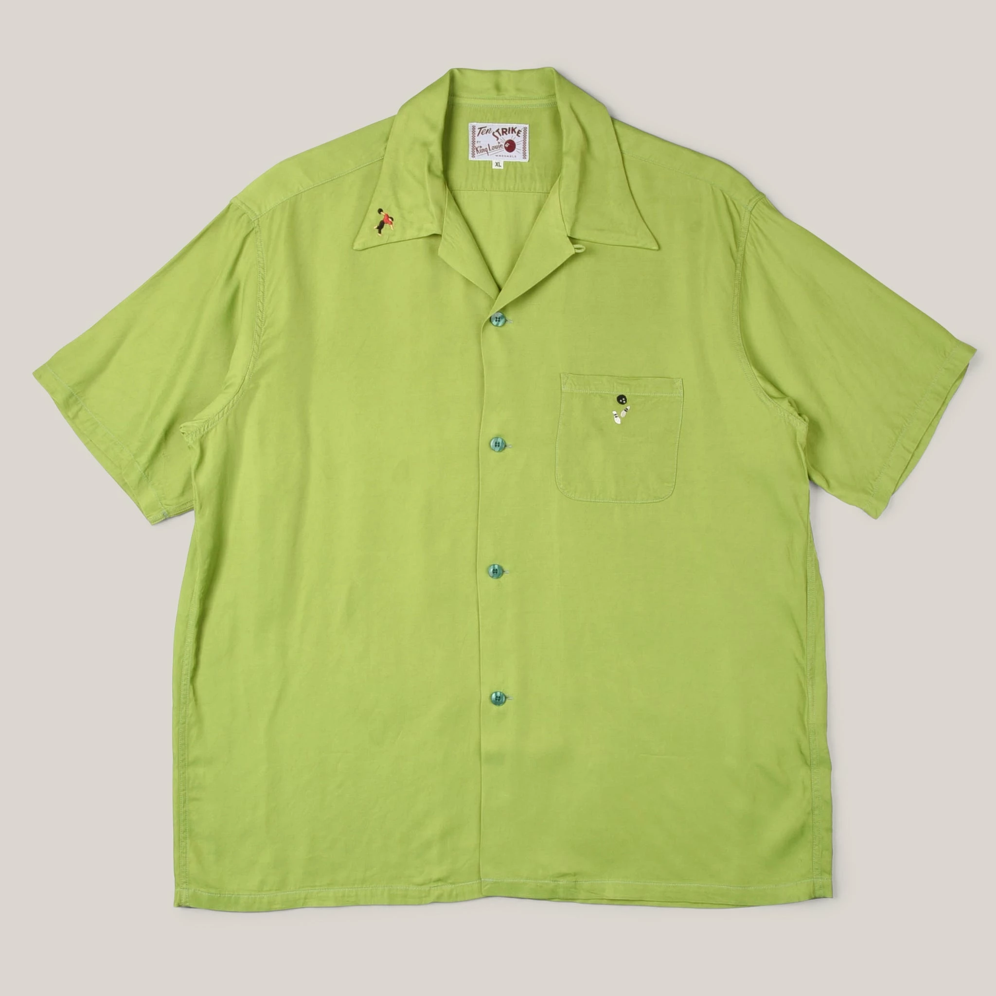 White Russian anyone…? Jesus himself would be proud of this pretty green bowling shirt, resplendent in green rayon with rayon embroidery on the lapel and pocket. The fit is boxy and relaxed as it should be, with open collar and chest pocket for cigarettes and score cards.