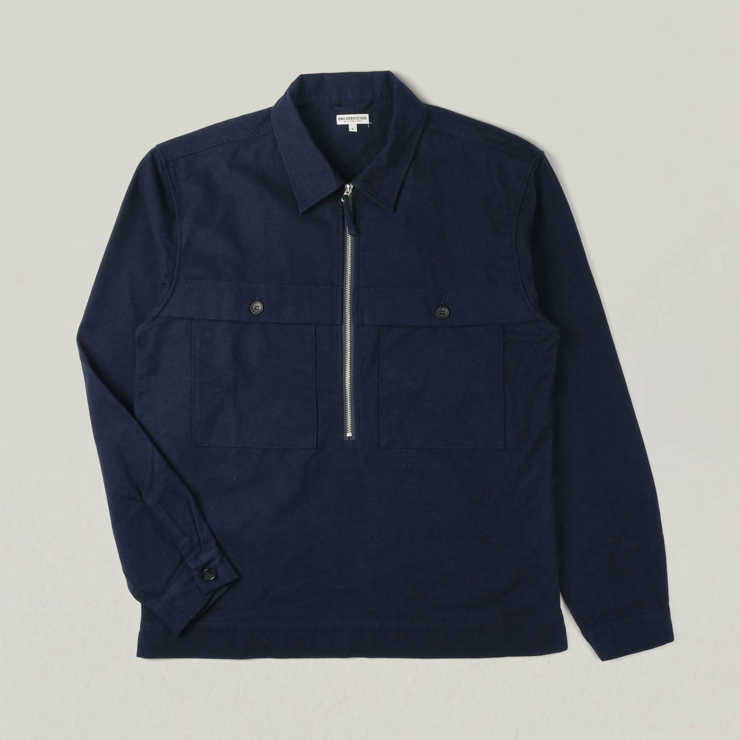 Thick moleskin over shirt with half zip fastening and covered chest pockets, a detail borrowed from vintage American outerwear. Details include split side seams for ease of wearing, buttoned cuffs and branding embroidered in tonal stitching.