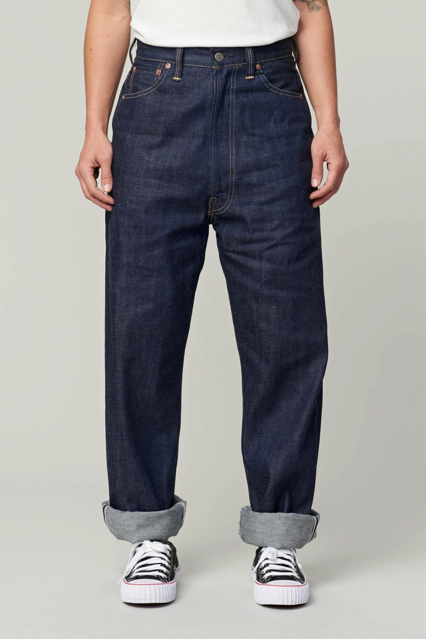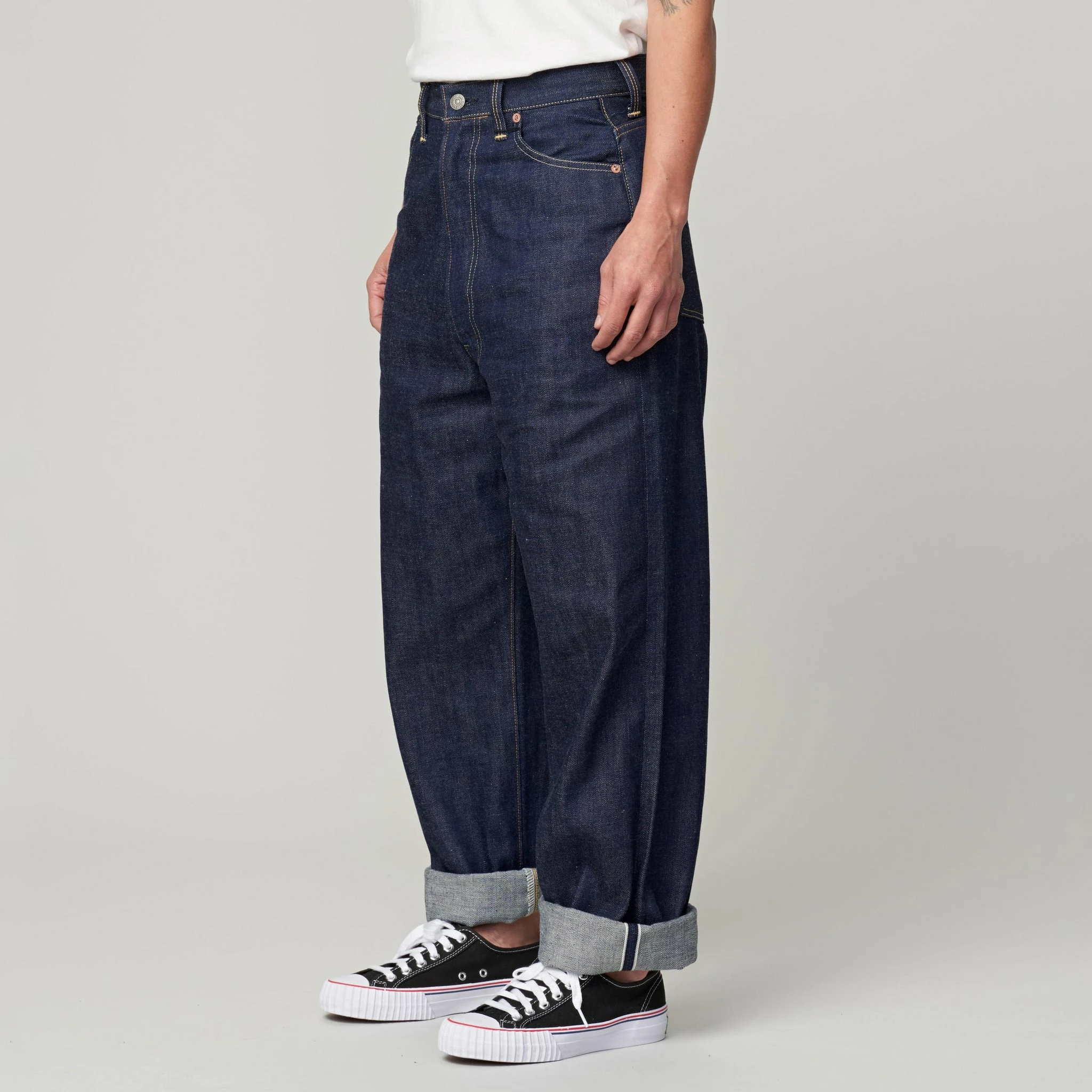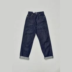 The Kay is a high waisted, wider leg pant made from 12oz original Selvedge denim, with pale pink line. Inspired by vintage 40s cuts, it has five pockets, the leg is nice and wide with a small waist.
