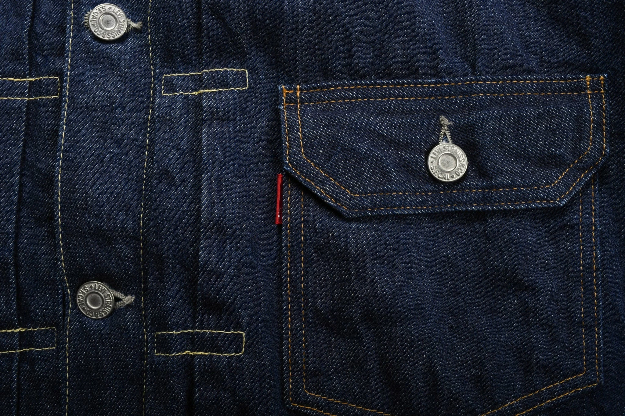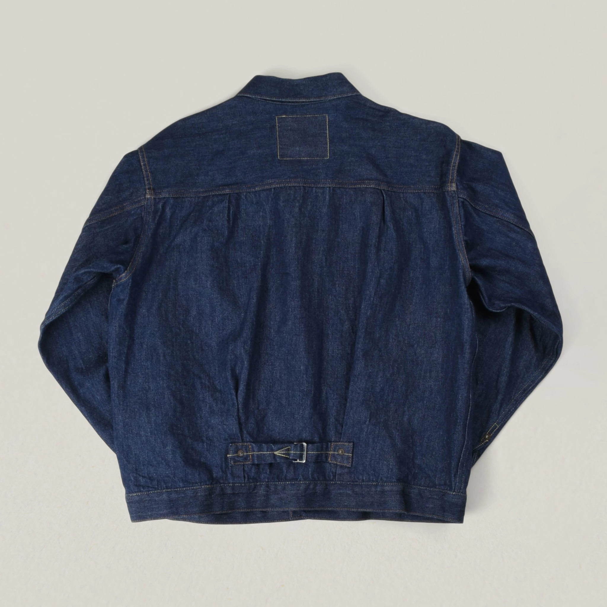 Where it all started in regards to denim jackets and eponymously named the Type I as a result. With a single left pocket on front and cinch on back, to the now famous pleat tuck detail to allow for middle age spread and further growth. It is an icon, much copied and rarely bettered. Further details include gold & tobacco contrast stitching used throughout. This one was made a few years ago when Cone Mills Denim shut down and they shifted all timeline denim construction to Turkey. Size 42 is a large equivalent.