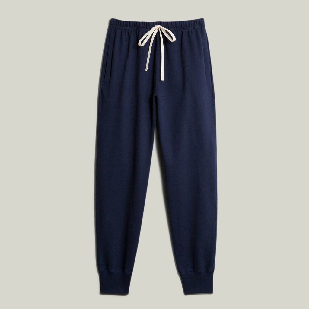 These luscious lounge pants are constructed in Germany using loop-wheeled machinery of yesteryear. The result is a soft, dense 12oz sweat pant that brings comfort time and time again after countless washes and reclining accidents. Details are simple with angled side pockets, a single back pocket and natural cotton drawstring. The length is a tad longer as the natural cotton shrinks slightly after the first wash.