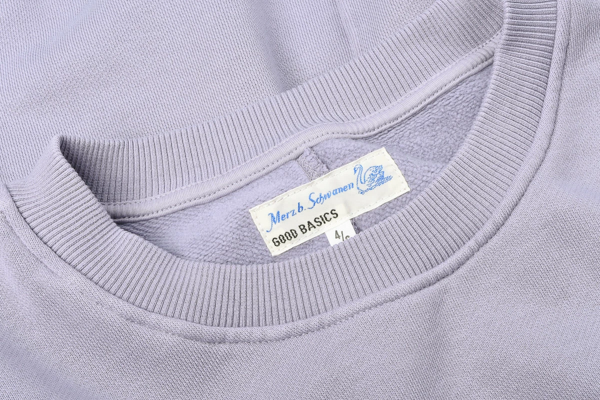 Oversized, relaxed fit sweatshirt from Merz B. Schwanen in this washed out lilac colour, constructed in a 13oz vintage fleece organic cotton with brushed inside. Details include swan logo tab at base and centre seam detail on back. Pair with matching sweatpants if you like lolling in lilac.