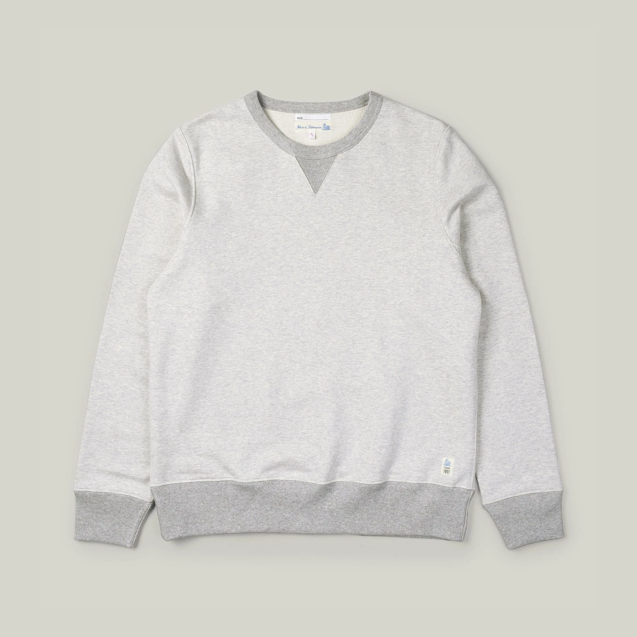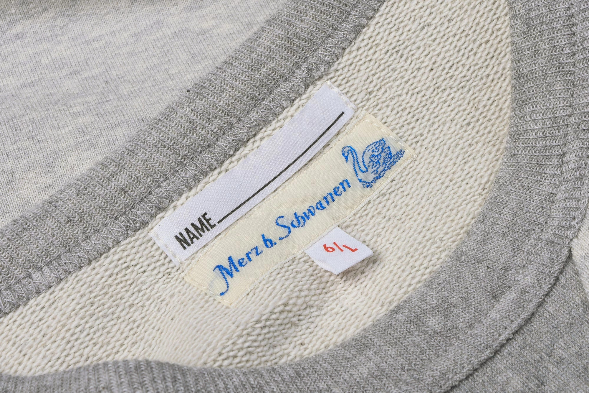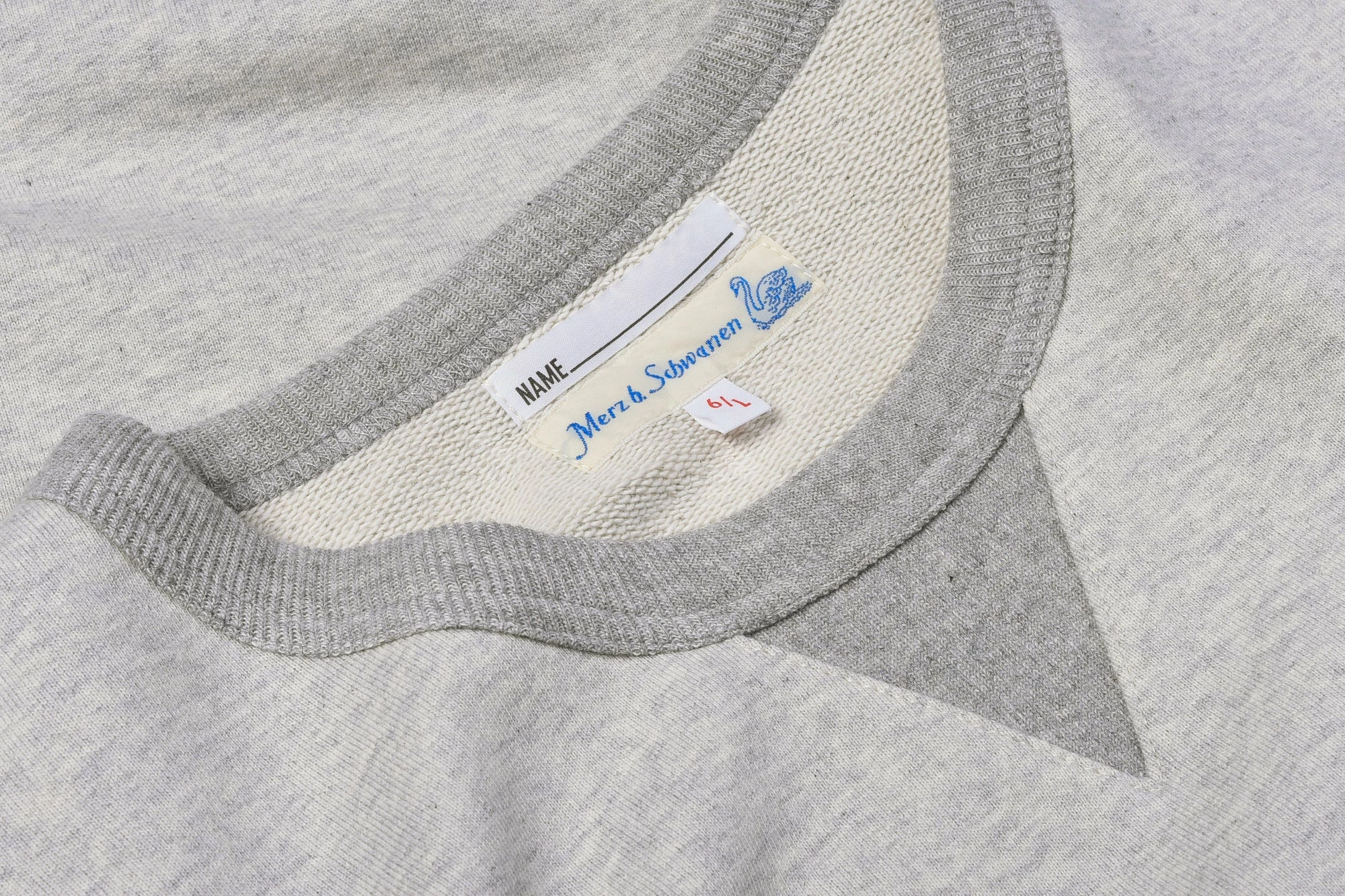 The 348 Sweatshirt from Merz b Schwanen is an updated version of the 346, a classic inset sleeve sweat from the German masters of circular knitting. The main difference being a contrast fabric on the triangular inserts on the neckline, cuffs and bottom hem. Plus a tiny embroidered patch on the bottom left and name tag inside neck.