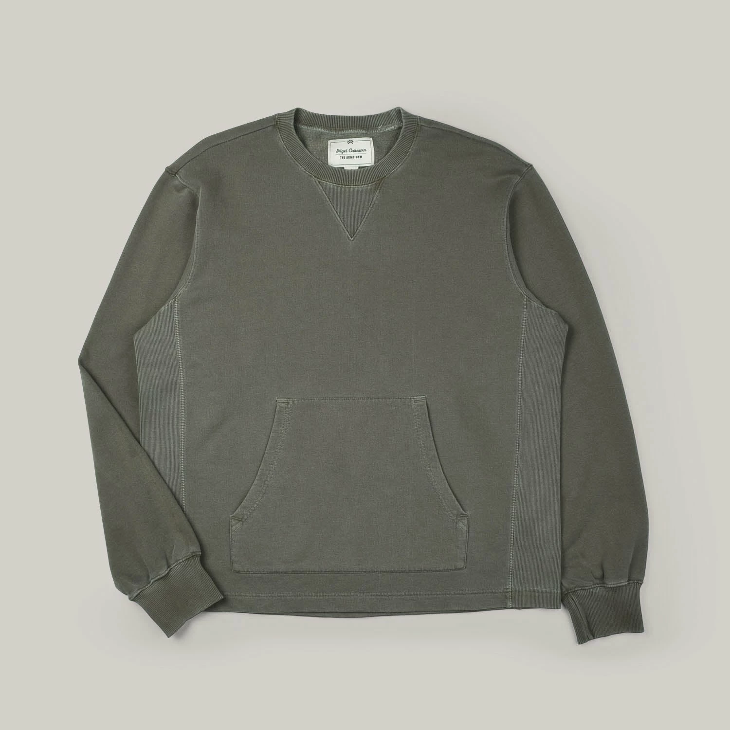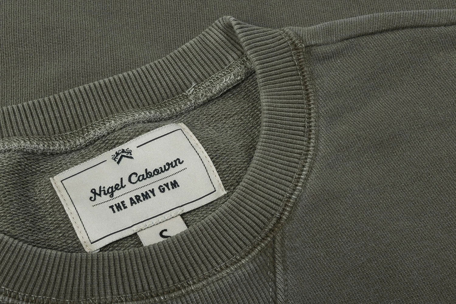Crew neck sweatshirt from Nigel’s Army Gym Collection with set in sleeve, ‘v’ neck vintage sweat detail to reinforce the neckline and ribbed side seams to aid movement, typified by Champion sweatshirts. Further details include kangaroo pocket on front. Fit is generous for comfort with this style, so size down if you’re after a slimmer look.