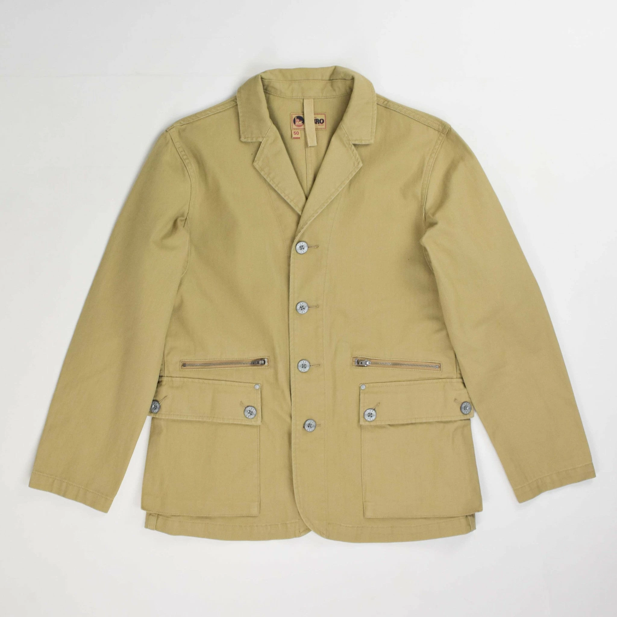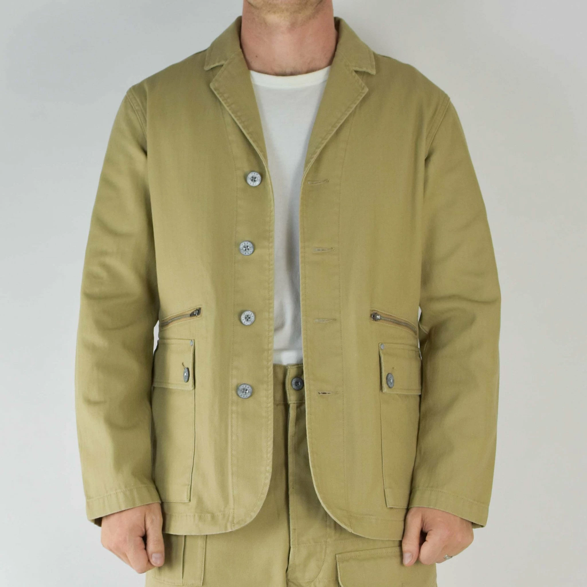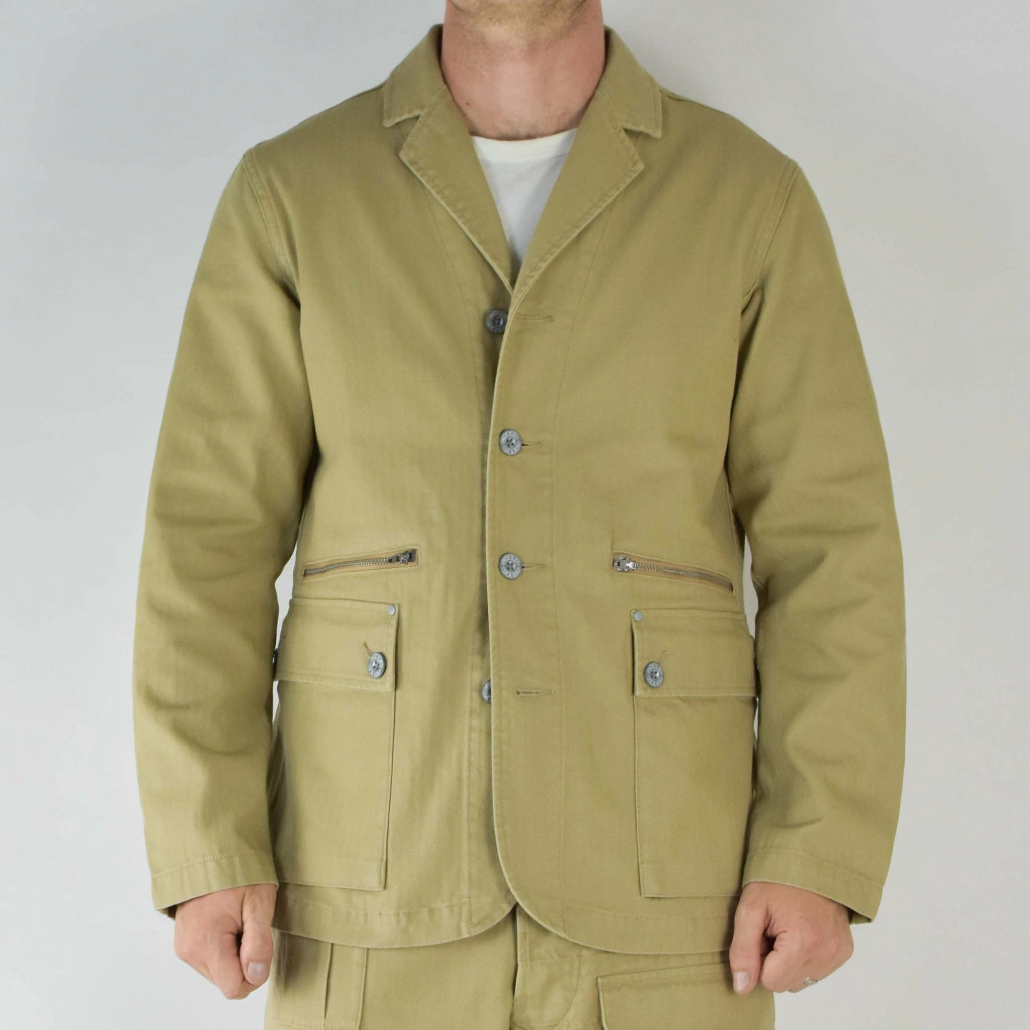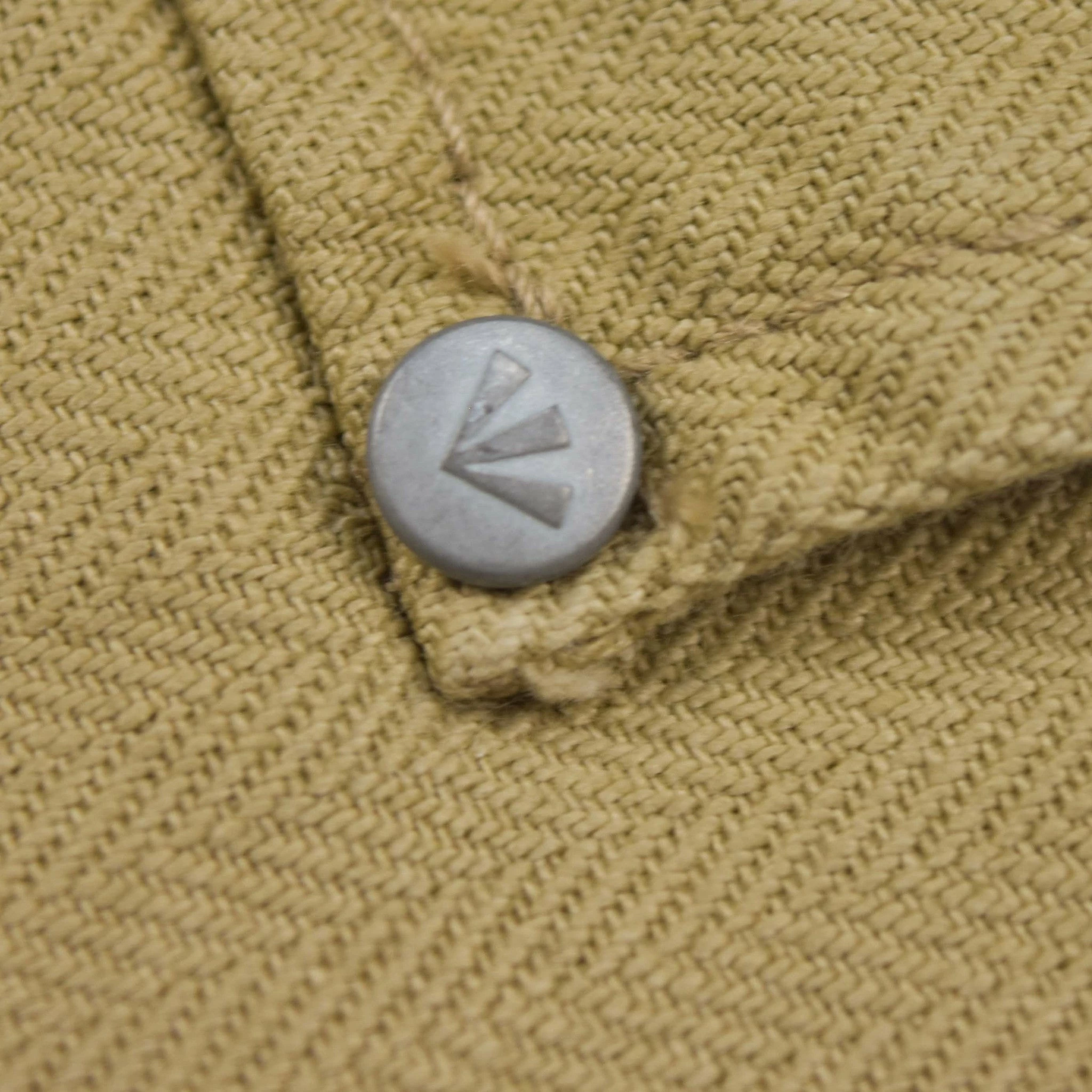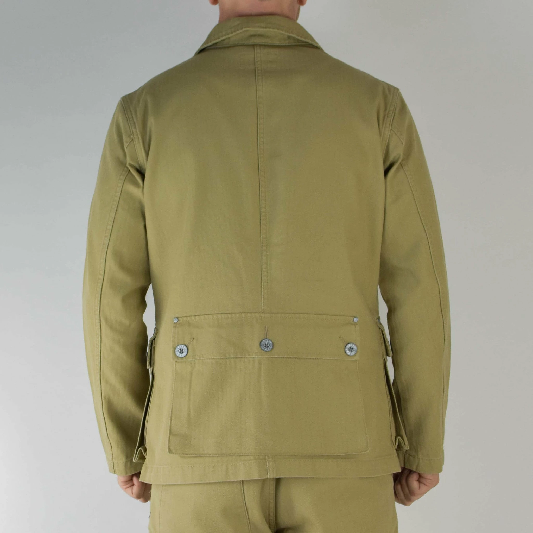 This new design for SS17 is based in fit on Nigel’s popular 6 Pocket Tenzing jacket. The pockets for this new style are based on the US Monkey Pant with two large bellow button down pockets on the front and one on the back plus with added zip pockets. Made in 100% cotton herringbone with a sulphur dye and wash to give it an aged appearance, this jacket also features metal eyelets under the arms for ventilation and specially developed Broad Arrow metal rivets. Can be worn with the British Army Desert Pant in the same fabric/colour to form a casual, work wear two-piece suit.