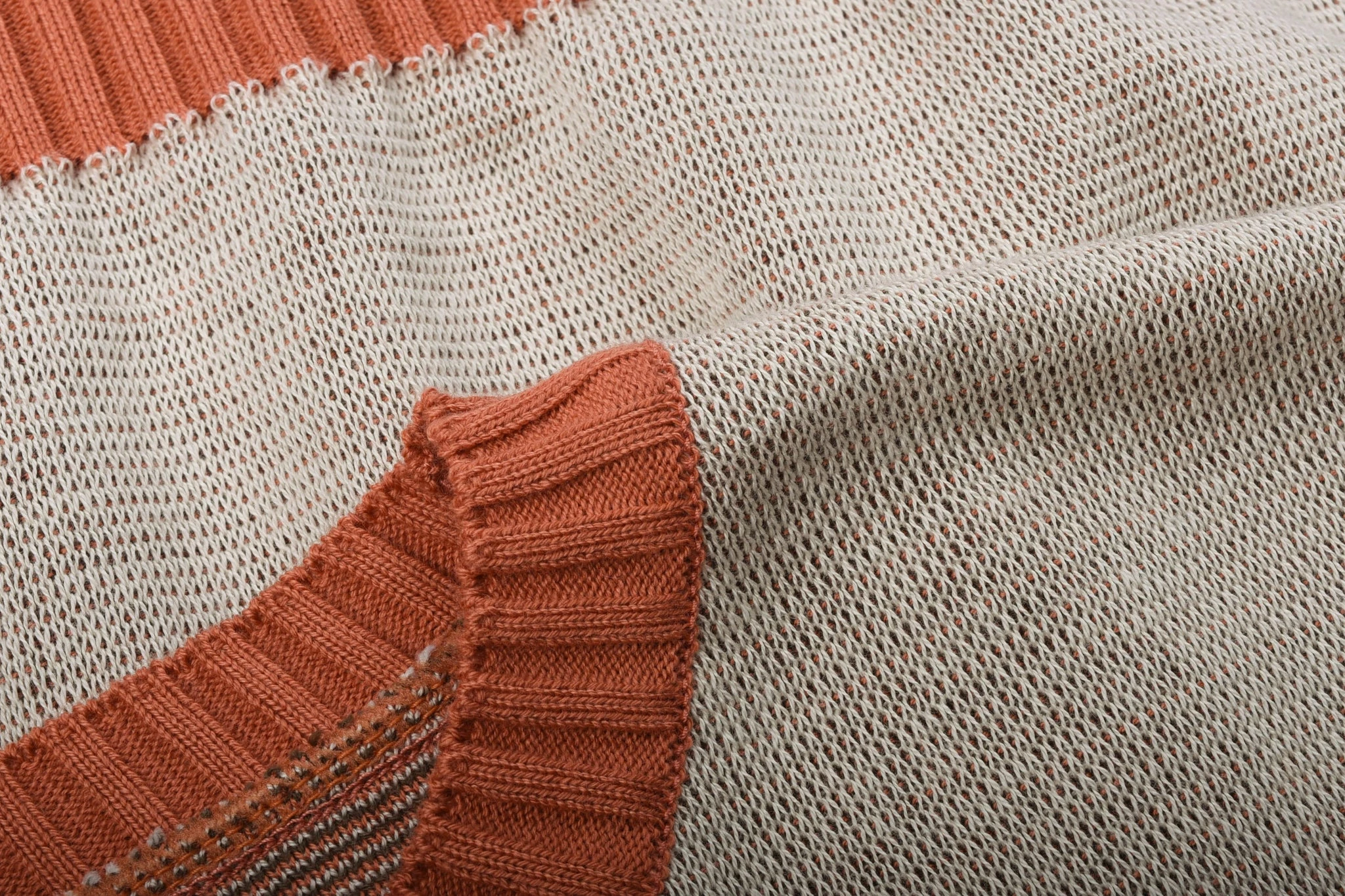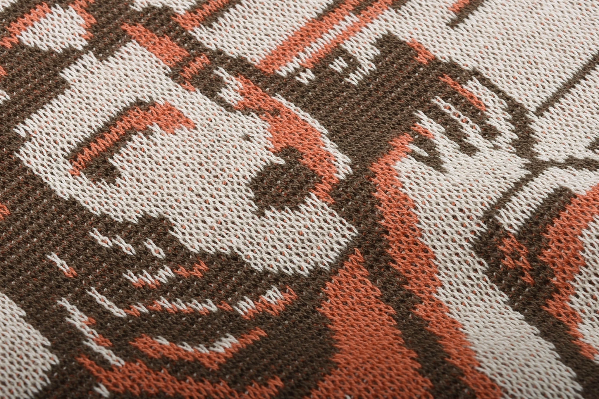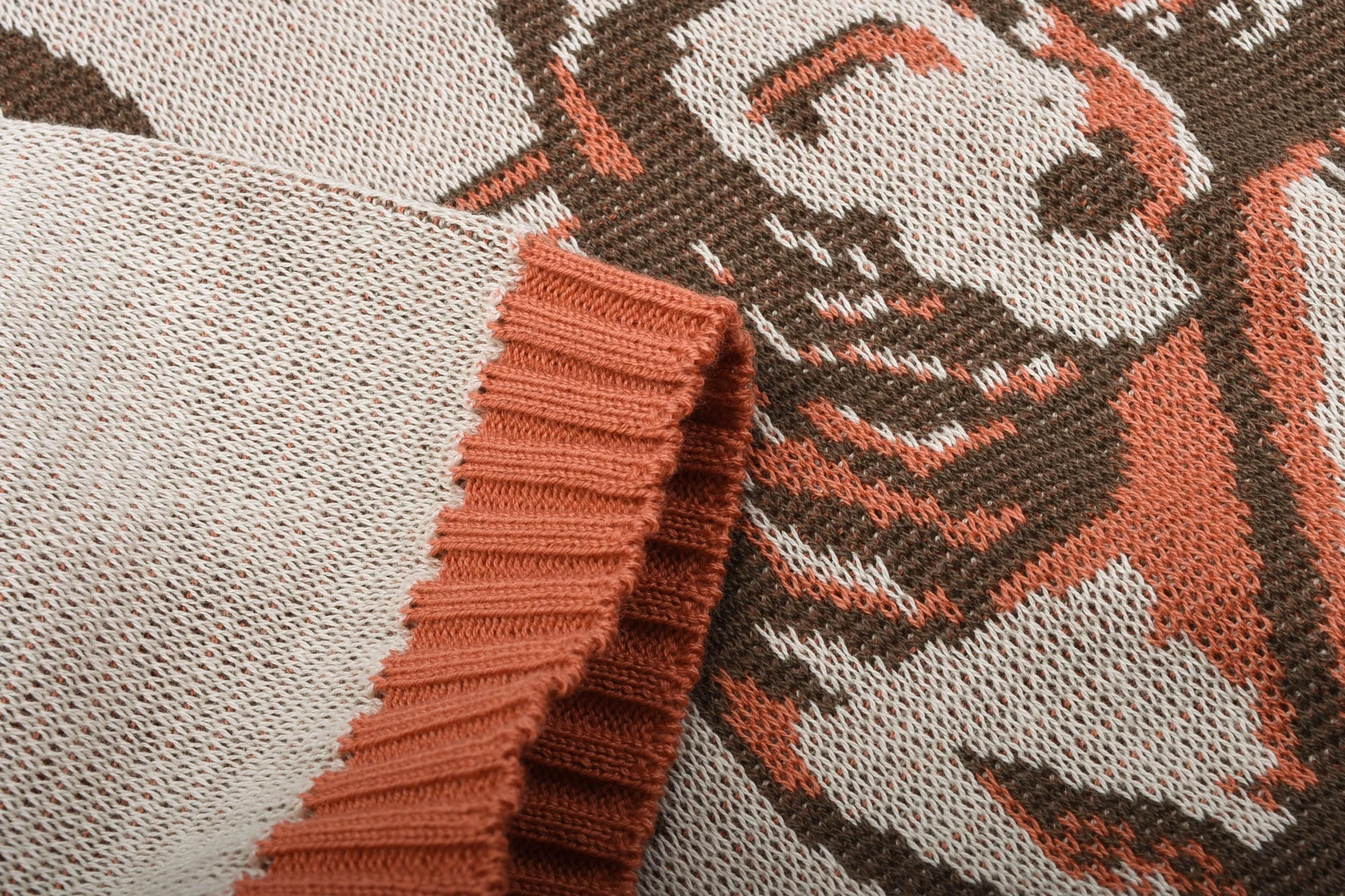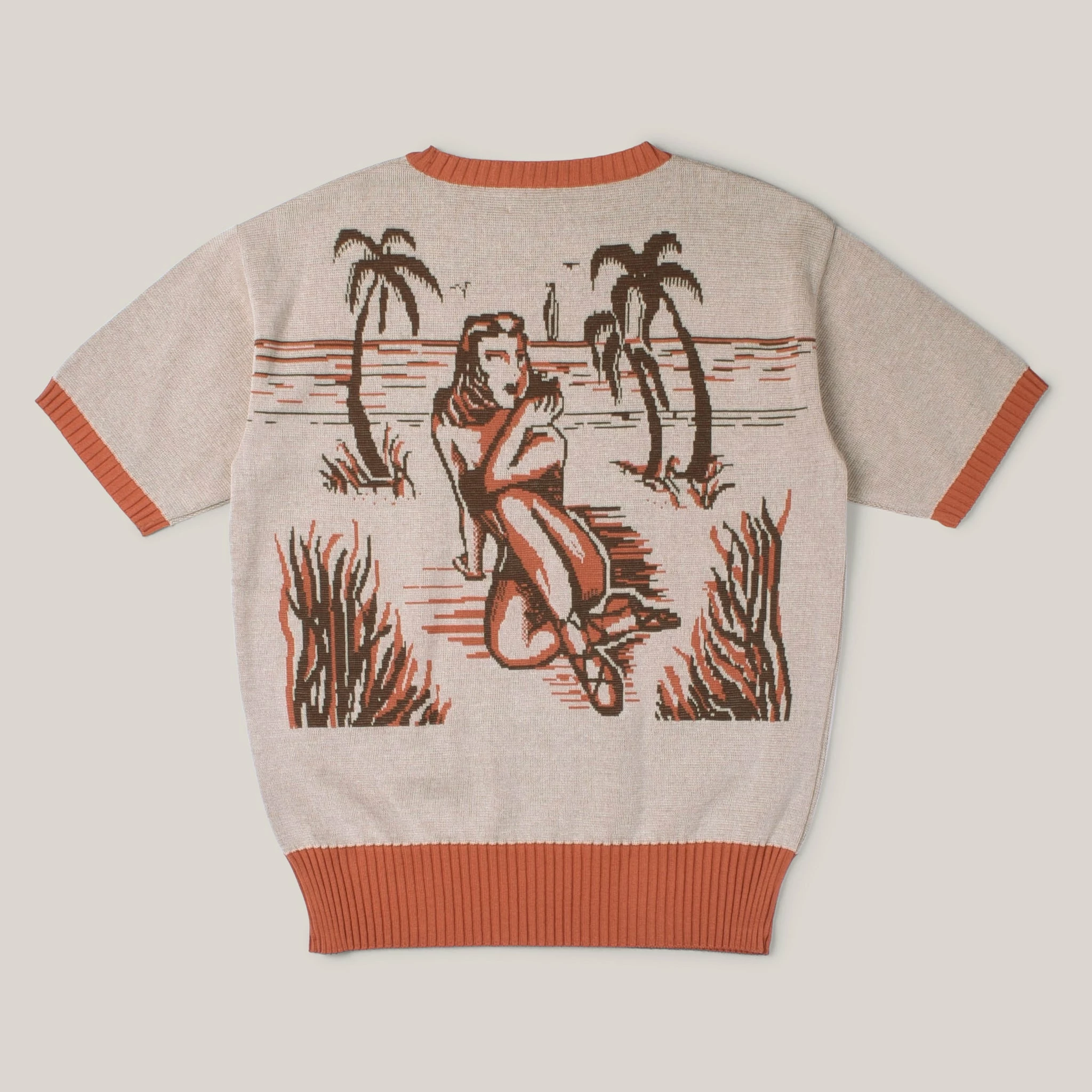 The Star of Hollywood arm of Toyo Enterprises specialises in garments that typify the era of Hollywood, from early to mid 20th century; the epitome of bygone glamour and spectacle. This piece is a faithful replication of a 1950’s pin-up sweater, made in a mid-weight cotton jacquard fabric, with orange collar, cuffs and bottom cuff.