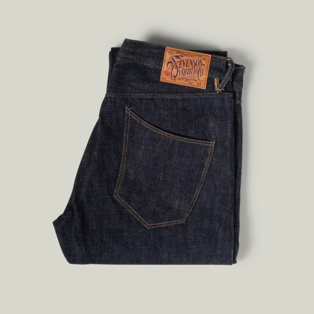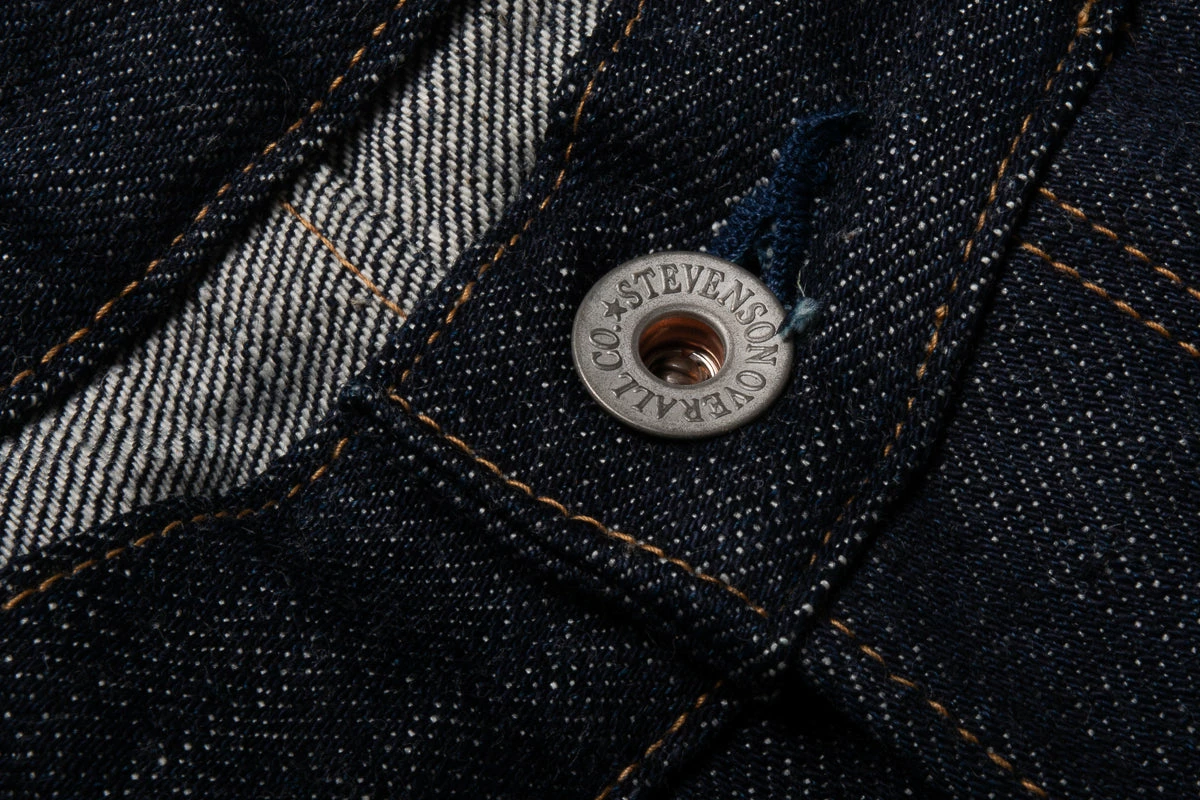 The denim fabric is exclusively produced for Stevenson Overalls on a vintage shuttle loom with Zimbabwe cotton. The 13oz. selvedge denim has a rough and slubby character, with a subtle green color undertone. (Made by Kuroki Mills) These have all been cold soaked to minimise any shrinkage, size down for a snug fit.