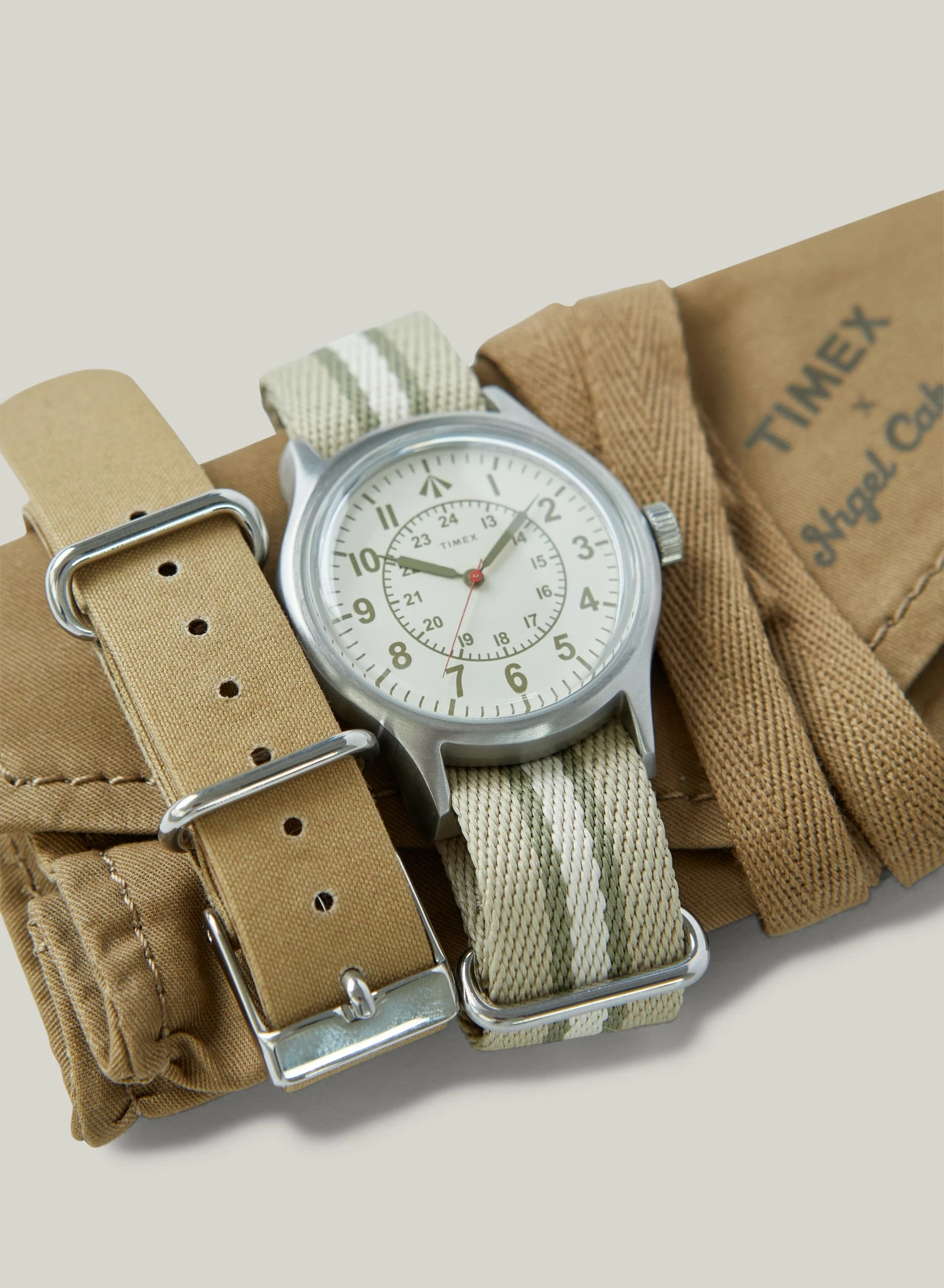 Featuring a white military-style dial with army green markings and the broad arrow design synonymous with the Cabourn military branding, presented with a neutral strap made with Ventile cotton, a natural barrier against destruction during inclement weather — This set comes with an additional striped slip-thru strap and is packaged in our iconic military-style carrying case – a set deserving of the past but stylised for today.