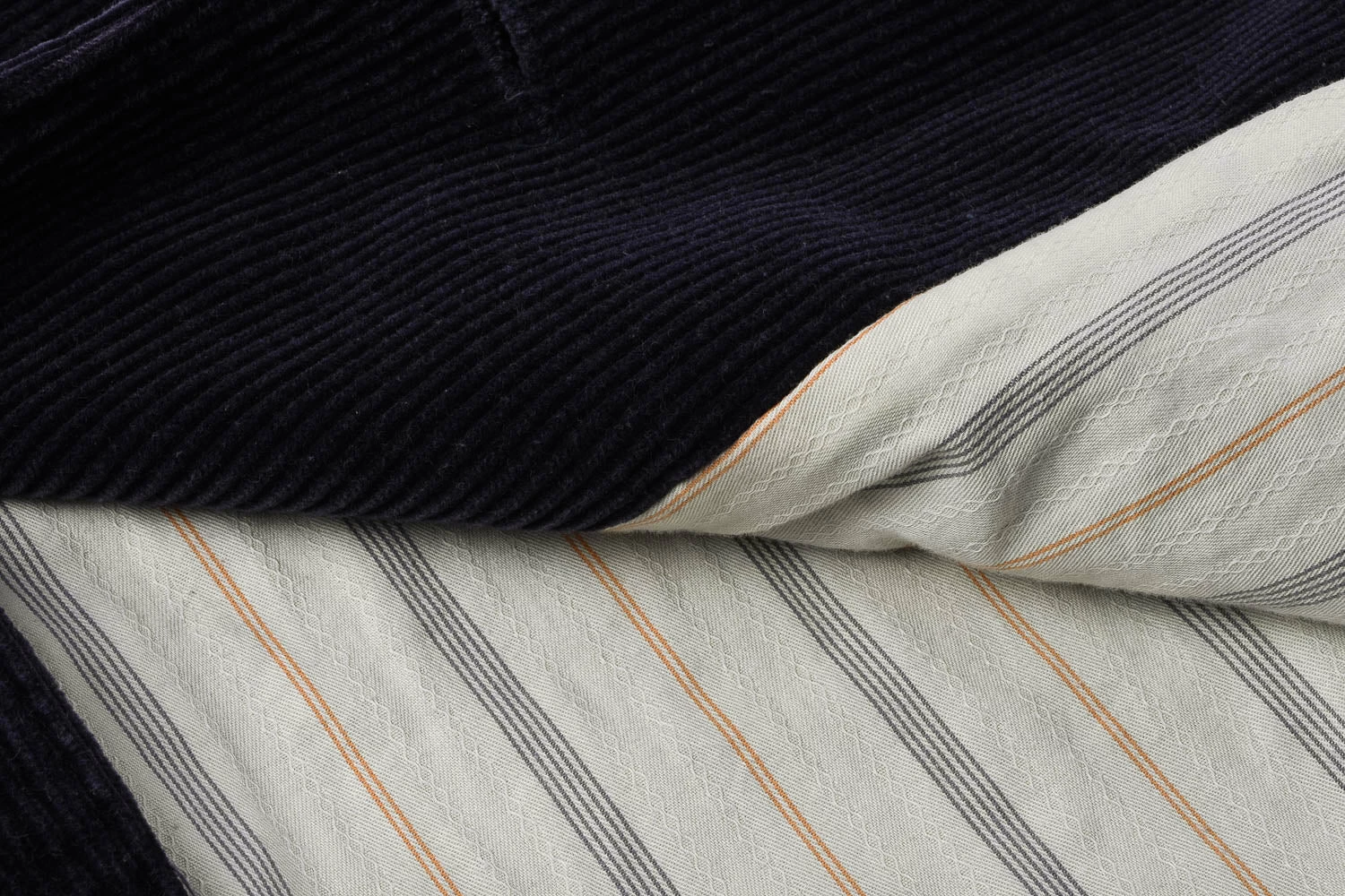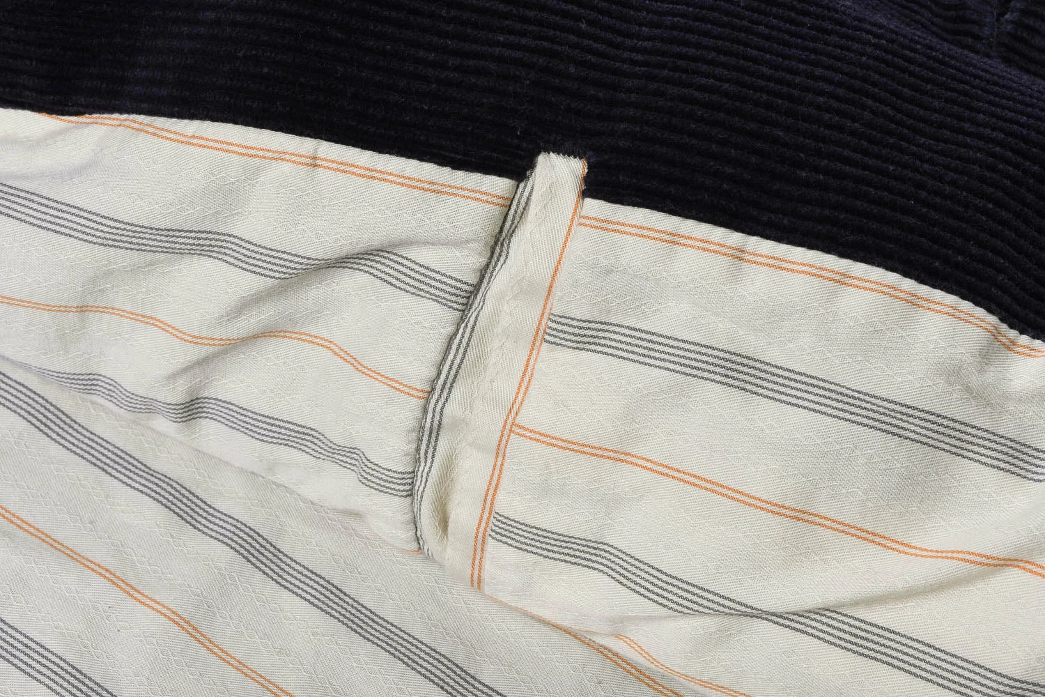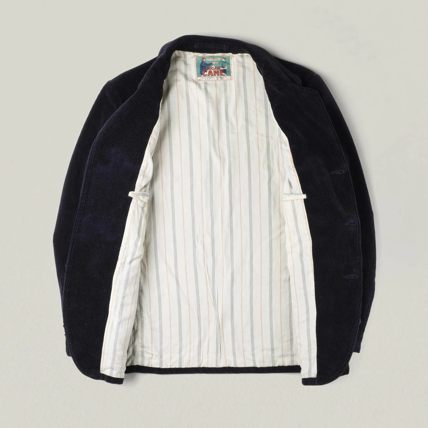 A subsection of Sugarcane is Fiction Romance, who always produce delectable pieces that appear just a notch above the rest. This jacket uses a heavy 14oz cord, 9 Wales to be precise; for corduroy aficionados. A dobby pyjama stripe lines the inside, with two front patch pockets and chest pocket, fixed on the bias to give horizontal texture. Details include three buttons and union made label on inside of neck and pocket.