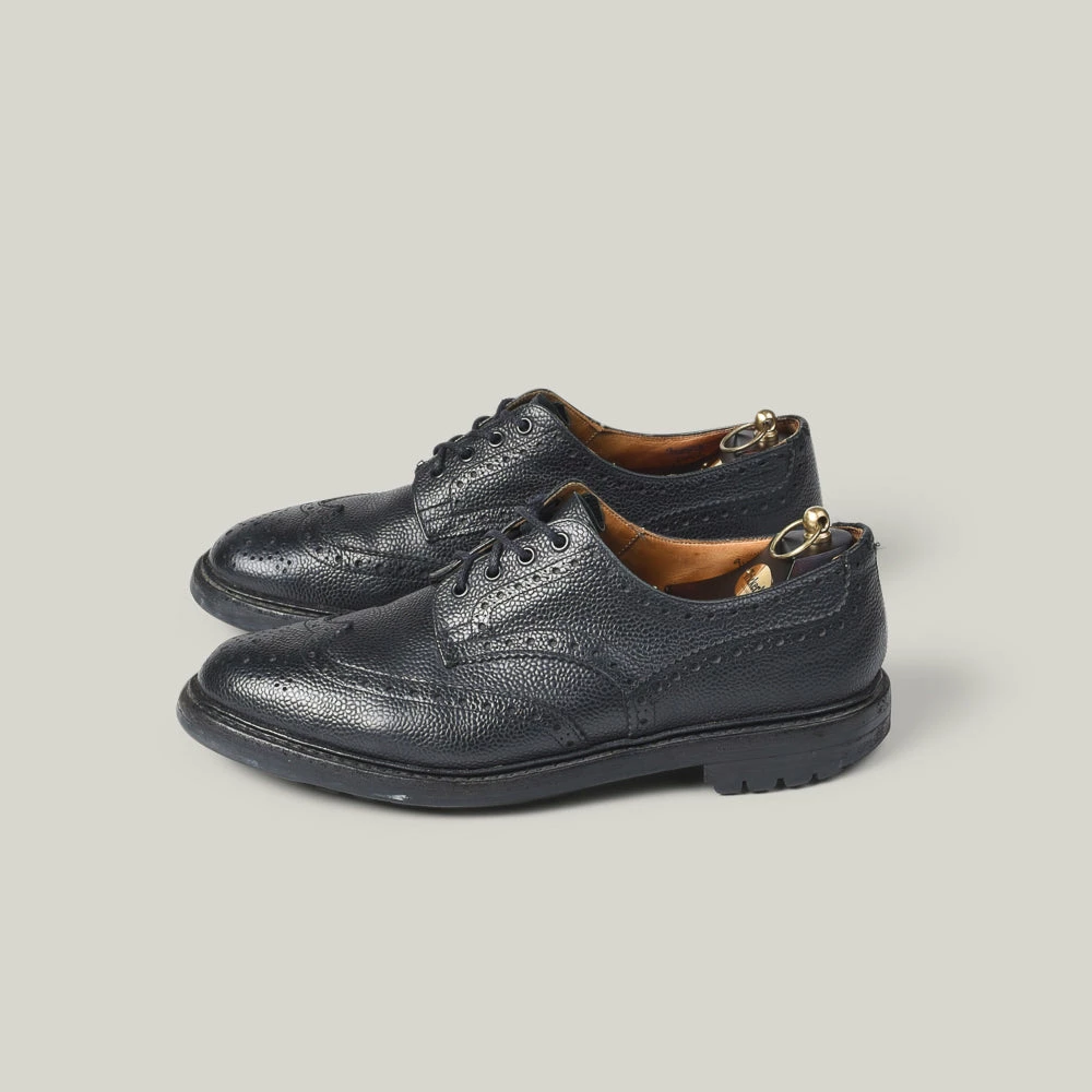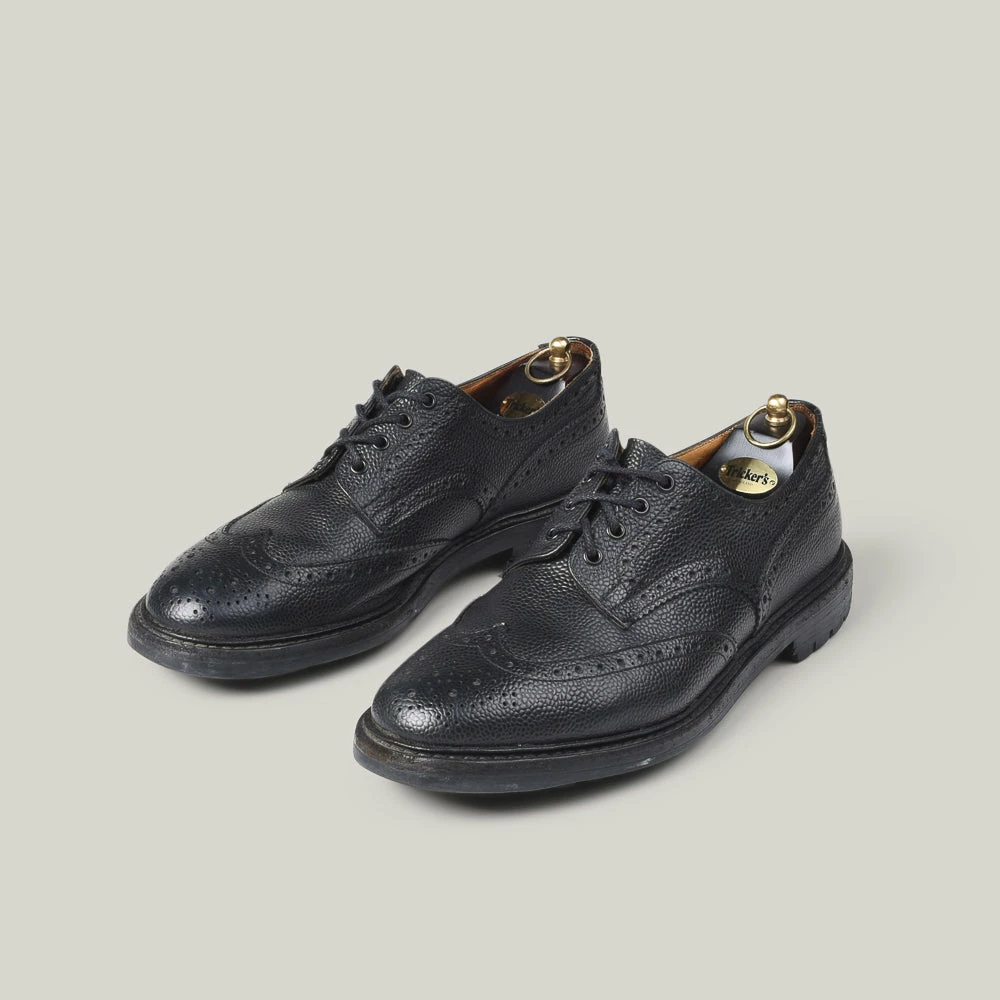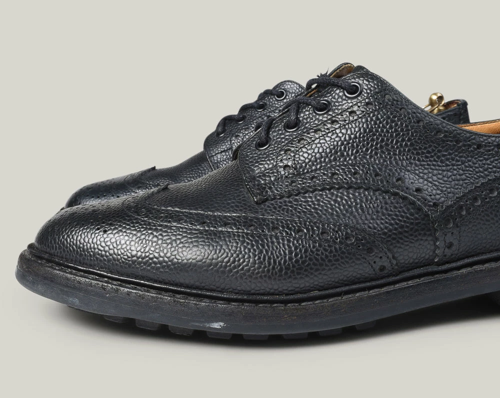 All black solid chunky brogue from English master shoemakers Tricker’s. Constructed in heavy black grain calf leather with a Goodyear welted construction on the bulletproof commando sole. Tough as old…shoes?